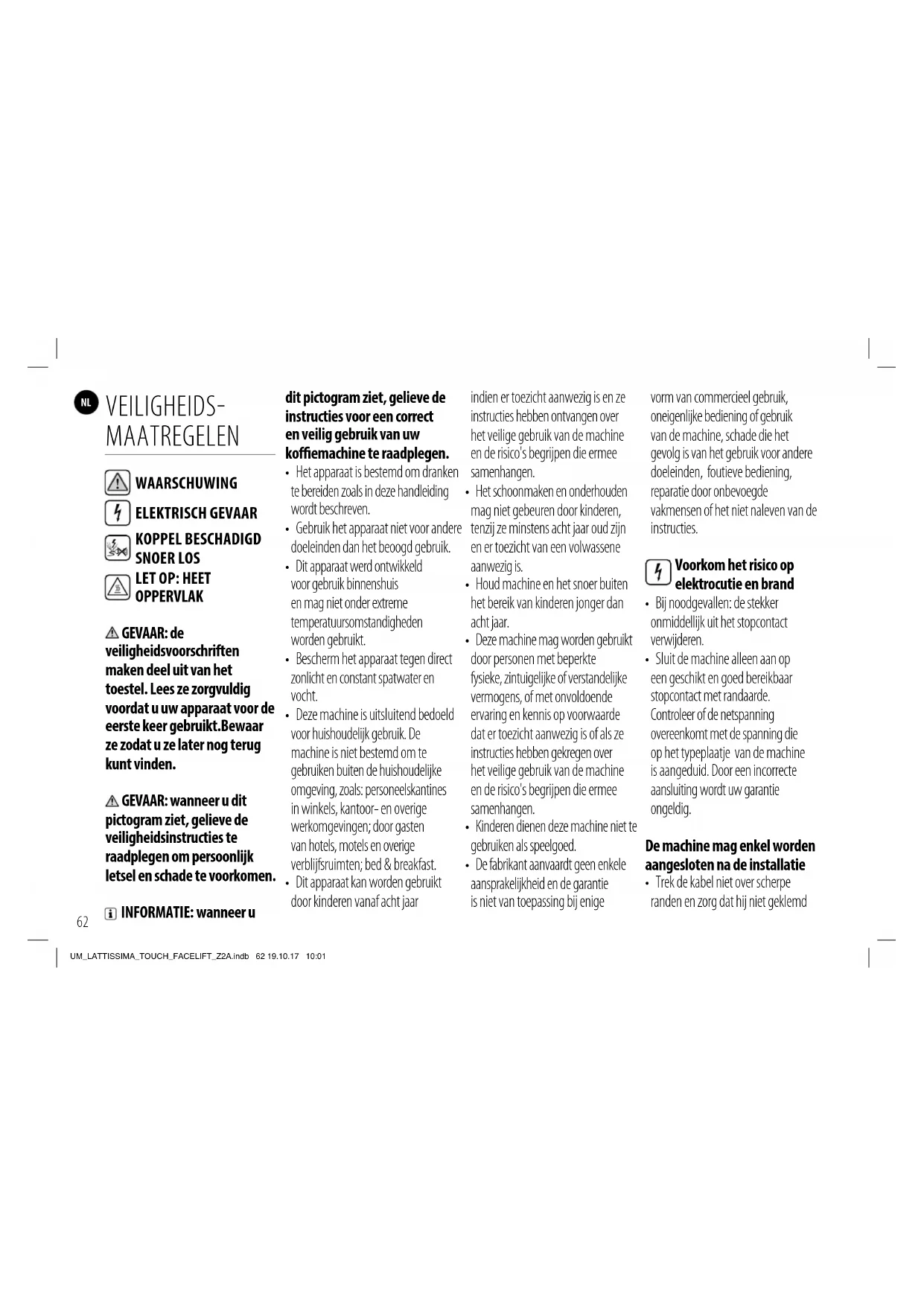 OPPERVLAK GEVAAR: de veiligheidsvoorschriften maken deel uit van het toestel. Lees ze zorgvuldig voordat u uw apparaat voor de eerste keer gebruikt.Bewaar ze zodat u ze later nog terug kunt vinden. GEVAAR: wanneer u dit pictogram ziet, gelieve de veiligheidsinstructies te raadplegen om persoonlijk letsel en schade te voorkomen. INFORMATIE: wanneer u dit pictogram ziet, gelieve de instructies voor een correct en veilig gebruik van uw koemachine te raadplegen.