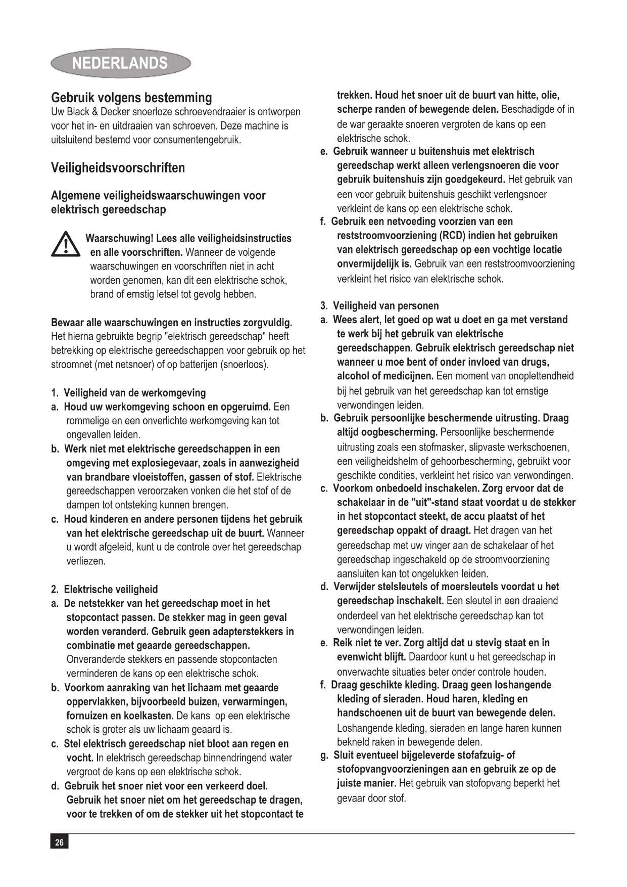 Kevin Hewitt Director of Consumer Engineering Spennymoor, County Durham DL16 6JG, Verenigd Koninkrijk 22-4-2009 Garantie Black & Decker heeft vertrouwen in zijn producten en biedt een uitstekende garantie. Deze garantiebepalingen vormen een aanvulling op uw wettelijke rechten en beperken deze niet. De garantie geldt in de lidstaten van de Europese Unie en de Europese Vrijhandelsassociatie. Mocht uw Black & Decker product binnen 24 maanden na datum van aankoop defect raken tengevolge van materiaal- of constructiefouten, dan garanderen wij de kosteloze vervanging van defecte onderdelen, de reparatie van het product of de vervanging van het product, tenzij: u Het product is gebruikt voor handelsdoeleinden, professionele toepassingen of verhuurdoeleinden; u Het product onoordeelkundig is gebruikt;u Het product is beschadigd door invloeden van buitenaf of door een ongeval; u Reparaties zijn uitgevoerd door anderen dan onze servicecentra of Black & Decker personeel. Om een beroep op de garantie te doen, dient u een aankoopbewijs te overhandigen aan de verkoper of een van onze servicecentra. U kunt het adres van het dichtstbijzijnde servicecentrum opvragen via de adressen op de achterzijde van deze handleiding. U kunt ook een lijst van onze servicecentra en meer informatie m.b.t. onze klantenservice vinden op het volgende Internet-adres: www.2helpU.com Meld u aan op onze website www.blackanddecker.nl om te worden geïnformeerd over nieuwe producten en speciale aanbiedingen. Verdere informatie over het merk Black & Decker en onze producten vindt u op www.blackanddecker.nl32 ESPAÑOL Finalidad El atornillador sin cable Black & Decker ha sido diseñado para atornillar y desatornillar. Esta herramienta está pensada únicamente para uso doméstico. Instrucciones de seguridad Advertencias de seguridad generales para herramientas eléctricas
