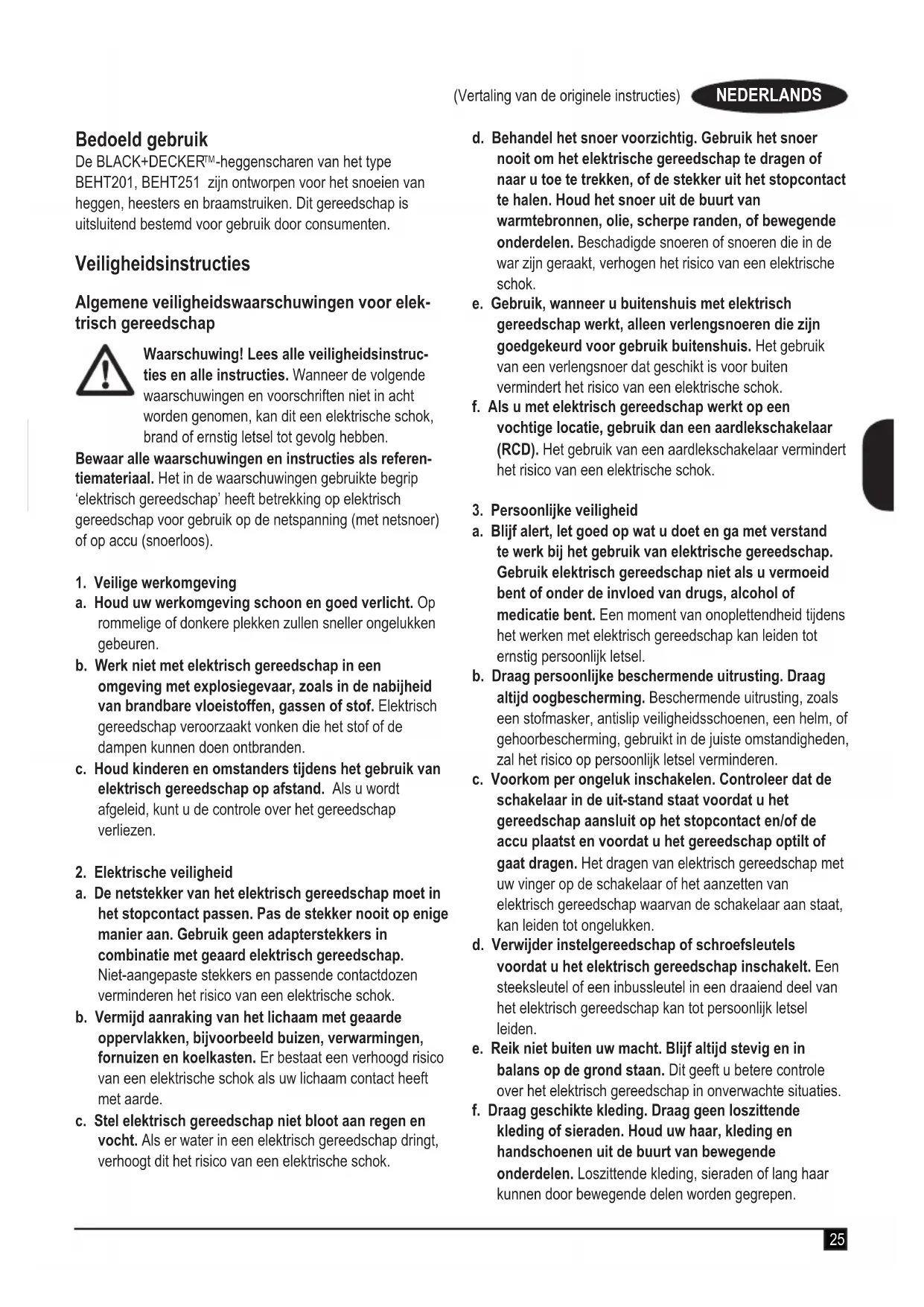 -heggenscharen van het type BEHT201, BEHT251 zijn ontworpen voor het snoeien van heggen, heesters en braamstruiken. Dit gereedschap is uitsluitend bestemd voor gebruik door consumenten. Veiligheidsinstructies Algemene veiligheidswaarschuwingen voor elek- trisch gereedschap Waarschuwing! Lees alle veiligheidsinstruc- ties en alle instructies. Wanneer de volgende waarschuwingen en voorschriften niet in acht worden genomen, kan dit een elektrische schok, brand of ernstig letsel tot gevolg hebben. Bewaar alle waarschuwingen en instructies als referen- tiemateriaal. Het in de waarschuwingen gebruikte begrip ‘elektrisch gereedschap’ heeft betrekking op elektrisch gereedschap voor gebruik op de netspanning (met netsnoer) of op accu (snoerloos).