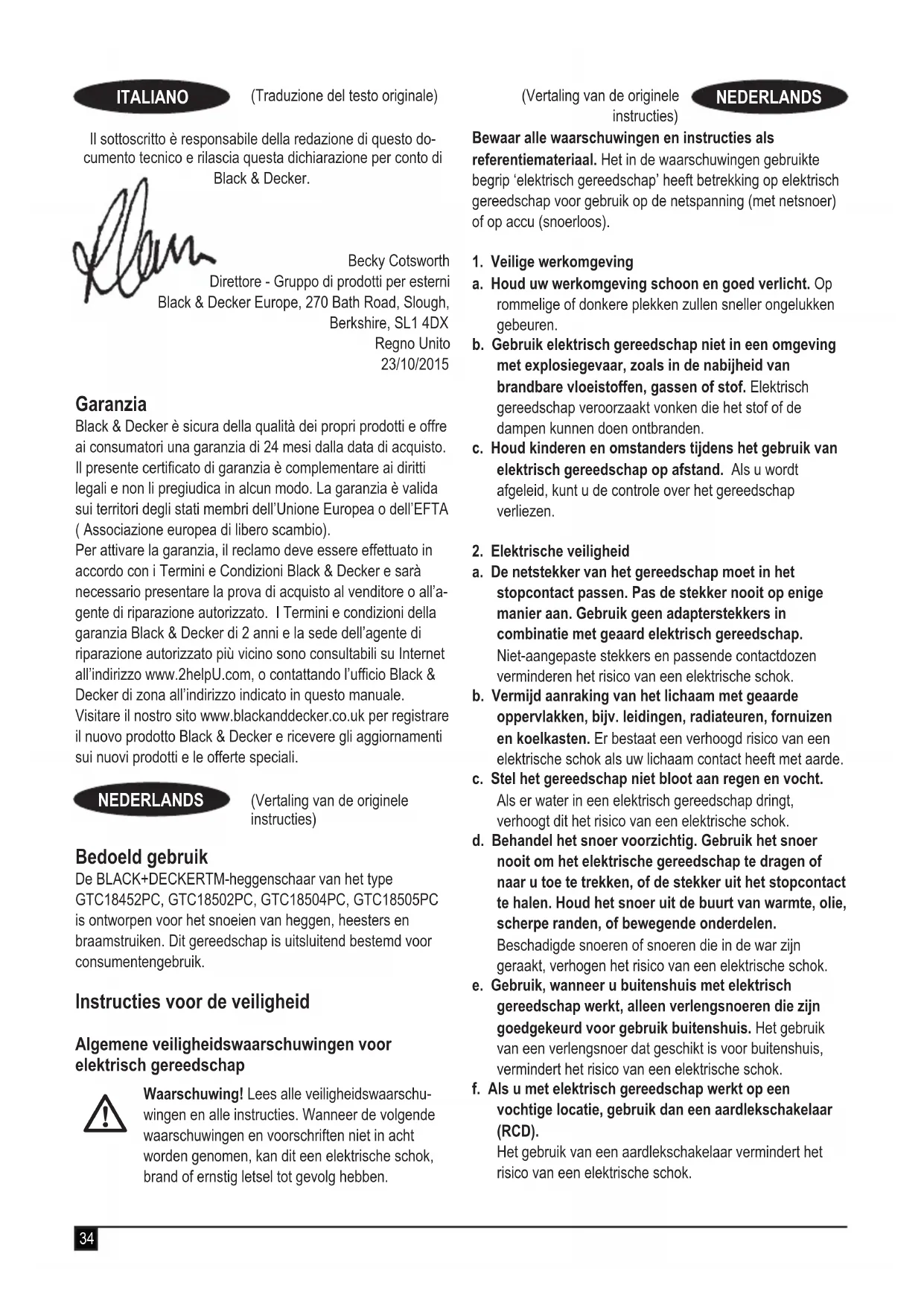 ) 90,5 dB(A) Meetonzekerheid (K) 3 dB(A) Gegarandeerd geluidsvermogen (LwA) 98 dB Deze producten voldoen tevens aan richtlijn 2014/30/EU en 2011/65/EU. Neem voor meer informatie contact op met Black & Decker op het volgende adres of raadpleeg de achterzijde van de handleiding. Ondergetekende is verantwoordelijk voor de samenstelling van het technische bestand en legt deze verklaring af namens Black & Decker. Becky Cotsworth Directeur - Outdoor Products Group Black & Decker Europe, 270 Bath Road, Slough, Berkshire, SL1 4DX Verenigd Koninkrijk 23-10-2015 Garantie Black & Decker heeft vertrouwen in zijn producten en biedt consumenten een garantie van 24 maanden vanaf de aankoopdatum. Deze garantie vormt een aanvulling op uw wettelijke rechten en beperken deze niet. De garantie is geldig op het grondgebied van de Lidstaten van de Europese Unie en de Europese Vrijhandelszone.42 (Vertaling van de originele instructies) NEDERLANDS (Traducción de las instrucciones originales) ESPAÑOL Voor een garantie-aanspraak moet uw aanspraak in overeenstemming zijn met de Voorwaarden en Condities van Black&Decker en moet u een bewijs van aankoop overleggen aan de verkoper of aan een geautoriseerde reparatiemonteur. Voorwaarden en condities van de 2-jarige garantie van Black&Decker en het adres van de vestiging van het geautoriseerde reparatiecentrum bij u in de buurt, kunt u vinden op internet op www.2helpU.com, of door contact op te nemen met het Black & Decker-kantoor ter plaatse, op het adres dat in deze handleiding wordt vermeld. Bezoek onze website www.blackanddecker.nl, waar u uw nieuwe Black & Decker-product kunt registreren en informatie kunt verkrijgen over nieuwe producten en speciale aanbiedingen. Uso previsto Los cortasetos BLACK+DECKERTM GTC18452PC, GTC18502PC, GTC18504PC, GTC18505PC se han diseñado para cortar setos, arbustos y zarzas. Esta herramienta ha sido concebida únicamente para uso doméstico. Instrucciones de seguridad Advertencias de seguridad generales para herrami- entas eléctricas