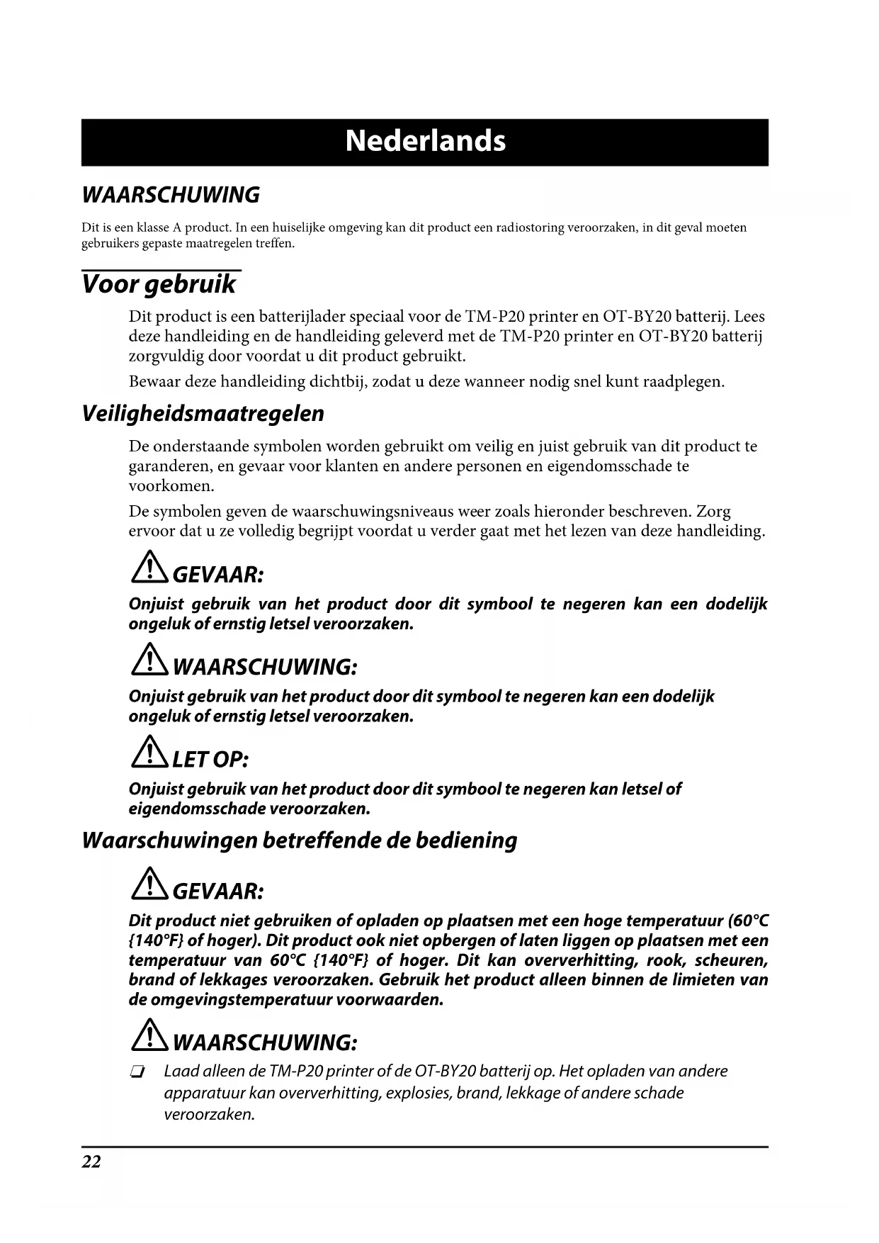 Laad alleen de TM-P20 printer of de OT-BY20 batterij op. Het opladen van andere apparatuur kan oververhitting, explosies, brand, lekkage of andere schade veroorzaken.23