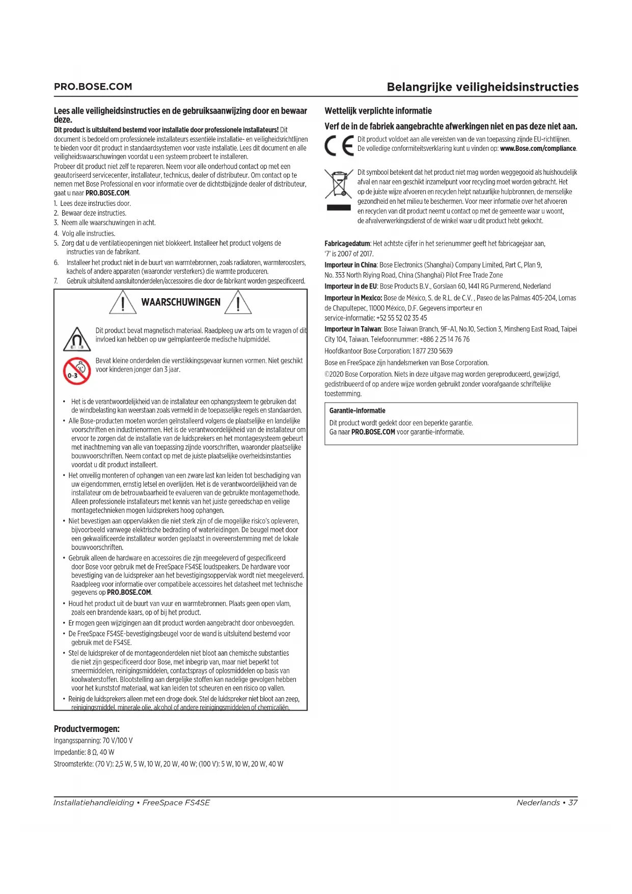 - Reinig de luidsprekers alleen met een droge doek. Stel de luidspreker niet bloot aan zeep, reinigingsmiddel, minerale olie, alcohol of andere reinigingsmiddelen of chemicaliën. Wettelijk verplichte informatie Verf de in de fabriek aangebrachte afwerkingen niet en pas deze niet aan. Dit product voldoet aan alle vereisten van de van toepassing zijnde EU-richtlijnen. De volledige conformiteitsverklaring kunt u vinden op: www.Bose.com/compliance. Dit symbool betekent dat het product niet mag worden weggegooid als huishoudelijk afval en naar een geschikt inzamelpunt voor recycling moet worden gebracht. Het opde juiste wijze afvoeren en recyclen helpt natuurlijke hulpbronnen, de menselijke gezondheid en het milieu te beschermen. Voor meer informatie over het afvoeren enrecyclen van dit product neemt u contact op met de gemeente waar u woont, deafvalverwerkingsdienst of de winkel waar u dit product hebt gekocht. Fabricagedatum: Het achtste cijfer in het serienummer geeft het fabricagejaar aan, ‘7’ is 2007 of 2017. Importeur in China: Bose Electronics (Shanghai) Company Limited, Part C, Plan 9, No. 353 North Riying Road, China (Shanghai) Pilot Free Trade Zone Importeur in de EU: Bose Products B.V., Gorslaan 60, 1441 RG Purmerend, Nederland Importeur in Mexico: Bose de México, S. de R.L. de C.V. , Paseo de las Palmas 405-204, Lomas de Chapultepec, 11000 México, D.F. Gegevens importeur en service-informatie: +52 55 52 02 35 45 Importeur in Taiwan: Bose Taiwan Branch, 9F-A1, No.10, Section 3, Minsheng East Road, Taipei City 104, Taiwan. Telefoonnummer: +886 2 25 14 76 76 Hoofdkantoor Bose Corporation: 1 877 230 5639 Bose en FreeSpace zijn handelsmerken van Bose Corporation. ©2020 Bose Corporation. Niets in deze uitgave mag worden gereproduceerd, gewijzigd, gedistribueerd of op andere wijze worden gebruikt zonder voorafgaande schriftelijke toestemming. Garantie-informatie Dit product wordt gedekt door een beperkte garantie. Ga naar PRO.BOSE.COM voor garantie-informatie. Productvermogen: Ingangsspanning: 70 V/100 V Impedantie: 8 Ω, 40 W Stroomsterkte: (70 V): 2,5 W, 5 W, 10 W, 20 W, 40 W; (100 V): 5 W, 10 W, 20 W, 40 W38 • Nederlands FreeSpace FS4SE • Installatiehandleiding