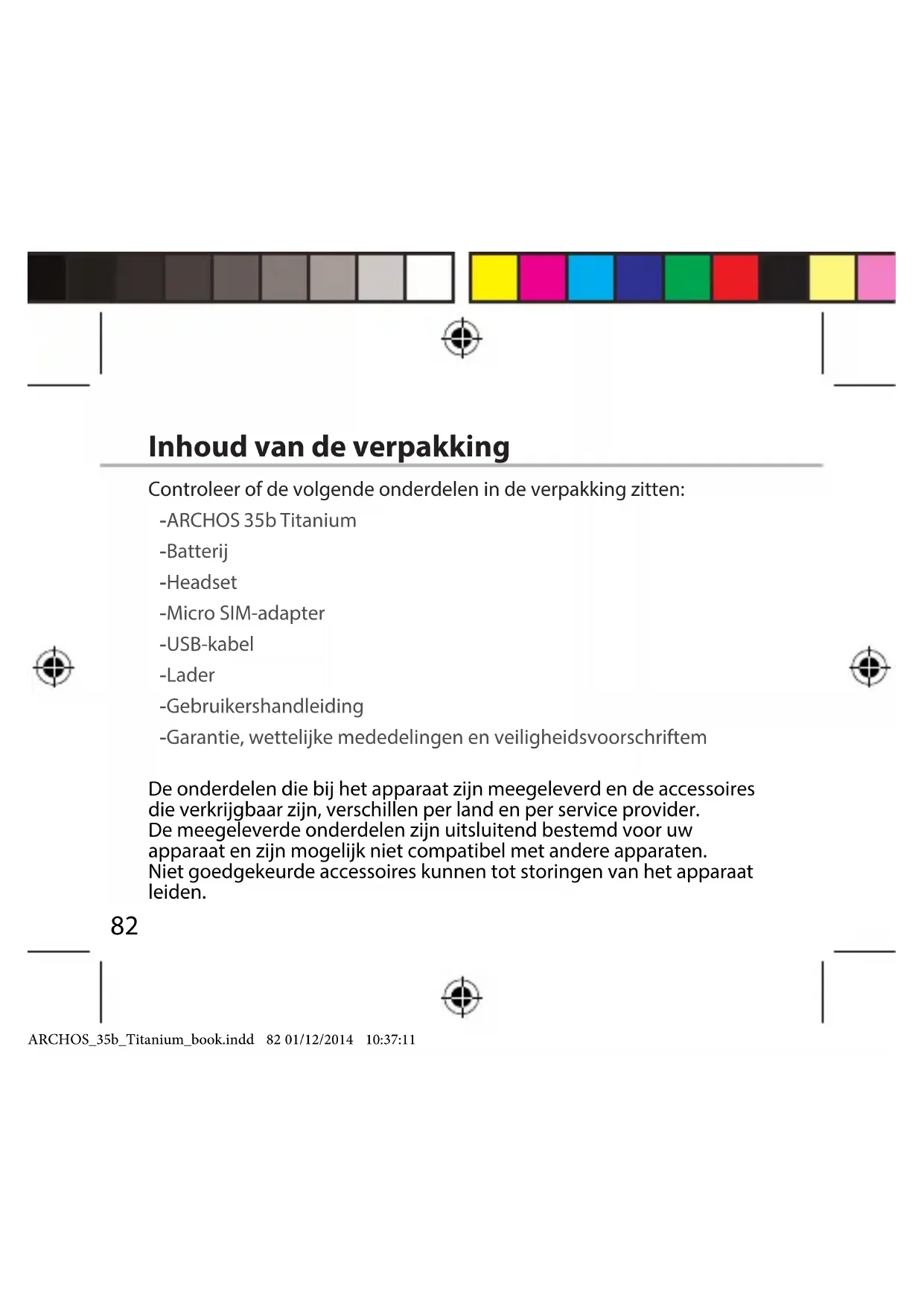 Raadpleeg voor meer informatie de veelgestelde vragen (FAQ's) op www.archos.com. Lees eerst de antwoorden op deze vragen voordat u het product terugstuurt. Uw probleem is dan mogelijk snel opgelost. Aangezien wij onze producten regelmatig updaten en verbeteren, kunnen de vormgeving en/of de functies van uw apparaatsoftware afwijken van de software in deze Verkorte handleiding. Raadpleeg de verklaring van overeenstemming op http://www.archos. com/products/declaration_conformity.html ARCHOS_35b_Titanium_book.indd 81 01/12/2014 10:37:1182 Inhoud van de verpakking Controleer of de volgende onderdelen in de verpakking zitten: - ARCHOS 35b Titanium - Batterij - Headset - Micro SIM-adapter - USB-kabel - Lader - Gebruikershandleiding - Garantie, wettelijke mededelingen en veiligheidsvoorschriftem De onderdelen die bij het apparaat zijn meegeleverd en de accessoires die verkrijgbaar zijn, verschillen per land en per service provider. De meegeleverde onderdelen zijn uitsluitend bestemd voor uw apparaat en zijn mogelijk niet compatibel met andere apparaten. Niet goedgekeurde accessoires kunnen tot storingen van het apparaat leiden. ARCHOS_35b_Titanium_book.indd 82 01/12/2014 10:37:1183