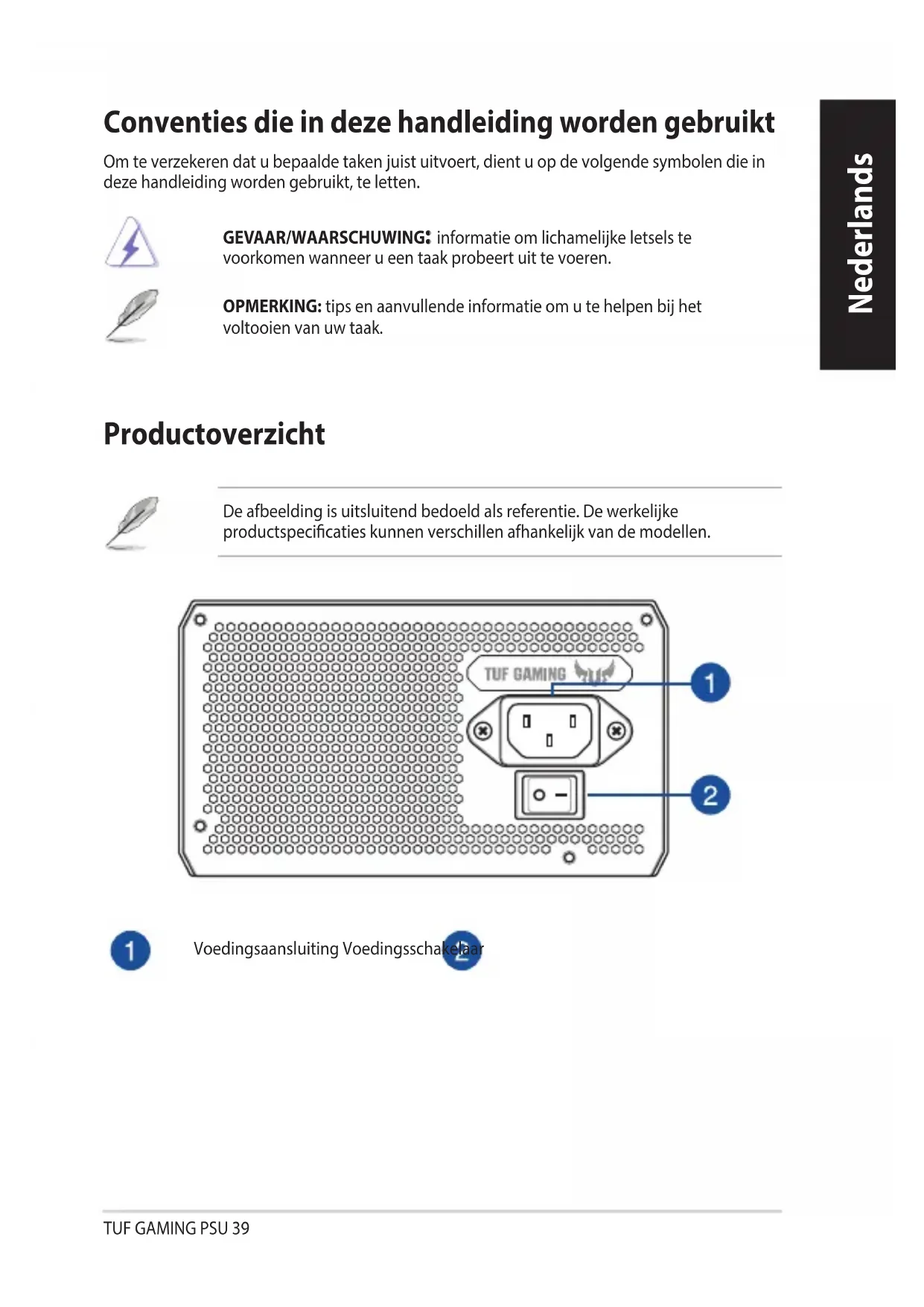 - V případě nedodržení pokynů výrobce a bezpečnostních pokynů ihned propadají veškeré záruky a jistoty. R45625 RoHSTUF GAMING PSU 39 Nederlands Nederlands Conventies die in deze handleiding worden gebruikt Om te verzekeren dat u bepaalde taken juist uitvoert, dient u op de volgende symbolen die in deze handleiding worden gebruikt, te letten. GEVAAR/WAARSCHUWING:: informatie om lichamelijke letsels te voorkomen wanneer u een taak probeert uit te voeren. OPMERKING: tips en aanvullende informatie om u te helpen bij het voltooien van uw taak. Productoverzicht De afbeelding is uitsluitend bedoeld als referentie. De werkelijke productspecicaties kunnen verschillen afhankelijk van de modellen. Voedingsaansluiting VoedingsschakelaarTUF GAMING PSU40 Nederlands Voordat u kabels installeert of verwijdert, moet u controleren of het systeem is uitgeschakeld en of alle voedingskabels voor het systeem en alle aangesloten apparaten zijn losgekoppeld.