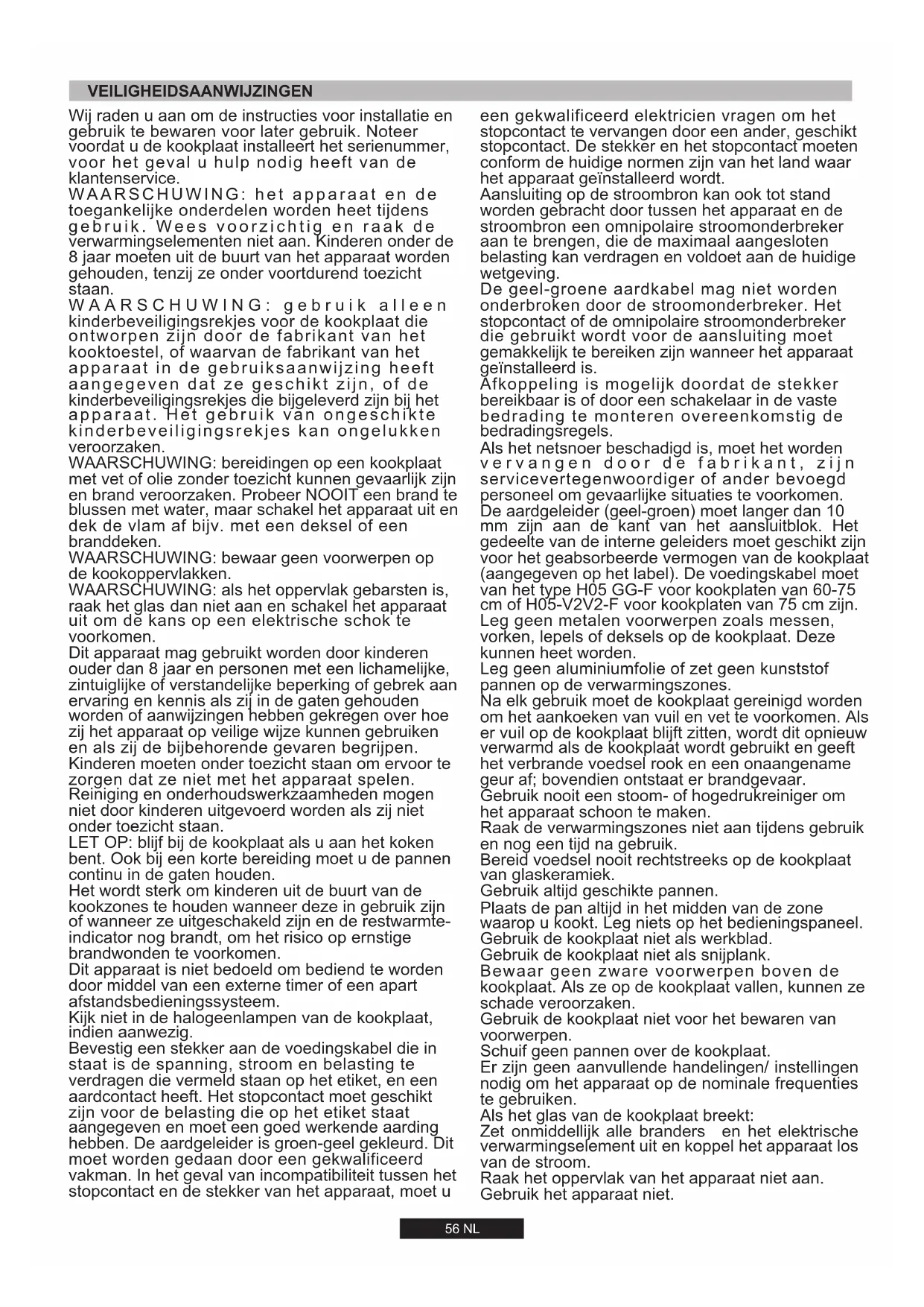 flexibel staal. Op het typeplaatje is aangegeven voor welke type gas dit apparaat geschikt is. Speciale aandacht zal worden besteed aan voorzieningen voor ventilatie. Alle installatie werkzaamheden dienen te worden gedaan met de stroom afgekoppeld van het stroomnet. De gasaansluiting dient te gebeuren volgens de voorschriften van het land van de installatie, pas nadat u gecontroleerd hebt of het type gas uit de fabriek overeenstemt met de installatie. Als dit niet het geval is, volg de onderstaande stappen. Belangrijk: controleer nadat u alle installatie handelingen heeft verricht de aansluitpunten op een goede afsluiting. Gebruik hiervoor een zeepsopje. Nooit een vlam. Controleer ook of de flexibele slang niet in aanraking komt met bewegende delen van de keukenmeubelen zoals een lade zodat de slang wordt beschadigd. Let op: als u een gasgeur ruikt die uit het toestel lijkt te komen, schakel dan onmiddellijk de gastoevoer dicht en bel een gekwalificeerde persoon. Ga niet op zoek naar een lek met een vlam. De aarde-draad (groen en geel van kleur) moet ten minste 10 mm langer zijn dan de beide andere draden. De doorsnee van de kabel moet in een goede verhouding staan tot de maximale aansluitwaarde van de kookplaat. Zie voor de netspanningsgegevens het typeplaatje op de kookplaat en controleer of het nieuwe netsnoer van het type H05 GG-F voor kookplaten van 60-75 cm of H05-V2V2-F voor kookplaten van 75 cm is. Wanneer die voedingskabel beschadigd is, dient deze vervangen te worden door een erkende reparateur, om onnodige risico's te vermijden. In het onwaarschijnlijke geval dat een scheur zou verschijnen op het glas, haal onmiddellijk de en neem contact op met de klantenservice. Het apparaat is niet bedoeld voor gebruik met een externe timer of afstandsbediening. stekker uit het contact