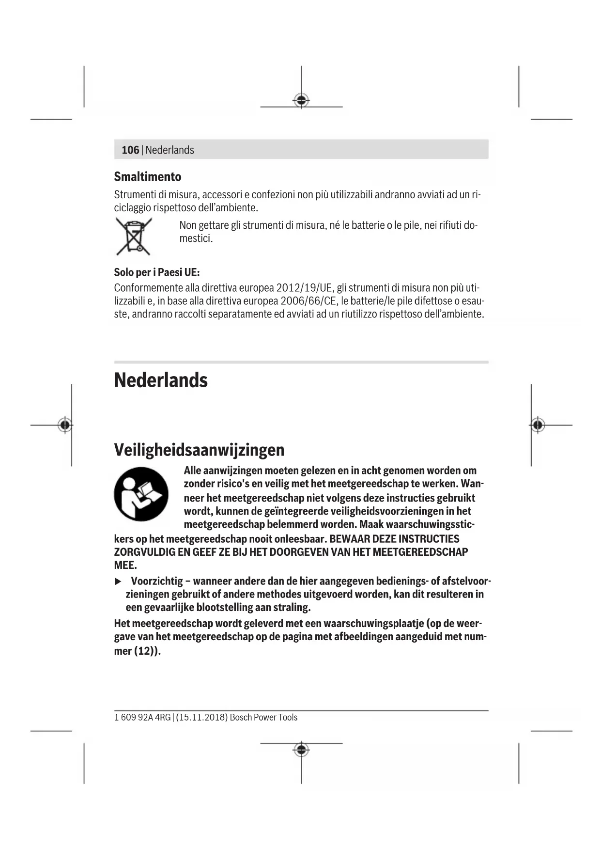 Druk op de toets(3)[+]. De berekende oppervlakte en het symbool„+“ verschijnen. Druk op de meettoets (2) [ ] om een verdere oppervlaktemeting te starten. Bepaal de oppervlakte conform het deel „Oppervlakteme- ting“ (zie „Oppervlaktemeting“, Pagina113). Zodra de tweede meting is afgesloten, verschijnt het resultaat van de tweede oppervlaktemeting onderaan op het display. Om het eindresultaat weer te geven, drukt u opnieuw op de meettoets (2) [ ]. Aanwijzing: Bij een lengtemeting verschijnt het eindresultaat direct. Om de optelfunctie te verlaten, drukt u op de toets (7) [Func]. Waarden aftrekken Voor het aftrekken van waarden drukt u op de toets(8)[–]. De verdere werkwijze ver- loopt zoals bij „Waarden optellen“. Meetwaarden wissen Door het kort indrukken van de aan/uit-toets (5) [ ] kunt u in alle meetfuncties de laatst bepaalde meetwaarde wissen. Door meerdere keren kort op de aan/uit-toets (5) [ ] te drukken worden de meetwaarden in omgekeerde volgorde gewist. Maateenheid wisselen Basisinstelling is de maateenheid „m“ (meter). Schakel het meetgereedschap in. Houd de toets (7) [Func] ingedrukt om in het menu „Basisinstellingen“ te komen. Kies „ft/m“. Druk op de toets (3) [+] of de toets (8) [–] om de maateenheid te wisselen. Voor het verlaten van het menupunt drukt u op de aan/uit-toets (5) [ ]. Na het uitscha- kelen van het meetgereedschap blijft de gekozen instelling opgeslagen. Geluid in- en uitschakelen In de basisinstelling is het geluid ingeschakeld. Schakel het meetgereedschap in. Houd de toets (7) [Func] ingedrukt om in het menu „Basisinstellingen“ te komen. Kies . Druk op de toets (3) [+] of de toets (8) [–] om het geluid in en uit te schakelen. Voor het verlaten van het menupunt drukt u op de meettoets (2) [ ] of op de aan/uit- toets (5) [ ]. Na het uitschakelen van het meetgereedschap blijft de gekozen instelling opgeslagen. Nederlands | 117 Bosch Power Tools 1 609 92A 4RG | (15.11.2018)118 | Nederlands 1 609 92A 4RG | (15.11.2018) Bosch Power Tools Aanwijzingen voor werkzaamheden Algemene aanwijzingen De ontvangstlens (14) en de uitgang van de laserstraal (15) mogen bij een meting niet afgedekt zijn. Het meetgereedschap mag tijdens een meting niet bewogen worden. Leg daarom het meetgereedschap het best tegen een vast aanslag- of steunvlak. Invloeden op het meetbereik Het meetbereik hangt van de lichtomstandigheden en de reflectie-eigenschappen van het doelvlak af. Gebruik voor de betere zichtbaarheid van de laserstraal bij sterk omge- vingslicht de laserbril (17) (accessoire) en het laserrichtbord (16) (accessoire) of be- schaduw het doelvlak. Invloeden op het meetresultaat Vanwege bepaalde eigenschappen van materialen kunnen bij metingen op sommige op- pervlakken foute metingen niet worden uitgesloten. Daartoe behoren: – transparante oppervlakken (bijv. glas, water) – spiegelende oppervlakken (bijv. gepolijst metaal, glas) – poreuze oppervlakken (bijv. isolatiemateriaal) – gestructureerde oppervlakken (bijv. ruw pleisterwerk, natuursteen). Gebruik eventueel op deze oppervlakken het laserrichtbord (16) (accessoire). Foute metingen zijn bovendien mogelijk op doelvlakken waarop schuin wordt gericht. Ook kunnen luchtlagen met verschillende temperaturen of indirect ontvangen weerspie- gelingen de meetwaarde beïnvloeden. Nauwkeurigheidscontrole en kalibrering van de hellingmeting (zie afbeeldingenE1–E2) Controleer regelmatig de nauwkeurigheid van de hellingmeting. Dit gebeurt door een om- slagmeting. Leg daarvoor het meetgereedschap op een tafel en meet de helling. Draai het meetgereedschap 180° en meet opnieuw de helling. Het verschil van de weergege- ven waarde mag max. 0,3° bedragen. Bij grotere afwijkingen moet u het meetgereedschap opnieuw kalibreren. Kies hiervoor in de instellingen. Volg de instructies op het display. Na sterke temperatuurveranderingen en na stoten raden we u een nauwkeurigheidscon- trole aan en evt. een kalibrering van het meetgereedschap. Na een temperatuurverande- ring moet het meetgereedschap zich een tijdje aan de temperatuur aanpassen, voordat een kalibrering plaatsvindt.Nauwkeurigheidscontrole van de afstandsmeting U kunt de nauwkeurigheid van het meetgereedschap als volgt controleren: – Kies een duurzaam onveranderlijke meetafstand van ca. 3 tot 10meter, waarvan u de lengte precies kent (bijvoorbeeld kamerbreedte, deuropening). De meting moet on- der gunstige omstandigheden worden uitgevoerd, d.w.z. het meettraject moet in de binnenruimte liggen met een zwakke achtergrondverlichting en het doelvlak van de meting moet glad en goed reflecterend zijn. – Meet het traject 10 keer na elkaar. De afwijking van de afzonderlijke metingen van de gemiddelde waarde mag maximaal ± 4mm over het volledige meettraject bij gunstige voorwaarden bedragen. Noteer de me- tingen om op een later tijdstip de nauwkeurigheid te kunnen vergelijken. Werken met het statief (accessoire) Het gebruik van een statief is vooral bij grotere afstanden noodzakelijk. Plaats het meet- gereedschap met de 1/4"-schroefdraad (13) op de snelwisselplaat van het statief (18) of een gangbaar fotostatief. Schroef het met de vastzetschroef van de snelwisselplaat vast. Stel het referentievlak voor metingen met statief dienovereenkomstig in door op de toets (4) te drukken (referentievlak schroefdraad). Foutmelding Wanneer een meting niet correct kan worden uitgevoerd, verschijnt de foutmelding „Er- ror“ op het display. Schakel het meetgereedschap uit en weer in en start de meting op- nieuw. Het meetgereedschap bewaakt het correcte functioneren bij elke me- ting. Als een defect wordt vastgesteld, verschijnt op het display alleen nog het hiernaast afgebeelde symbool en het meetgereedschap wordt uitgeschakeld. In dit geval laat u het meetgereedschap via uw dealer naar de Bosch klantenservice opsturen. Onderhoud en service Onderhoud en reiniging Houd het meetgereedschap altijd schoon. Dompel het meetgereedschap niet in water of andere vloeistof