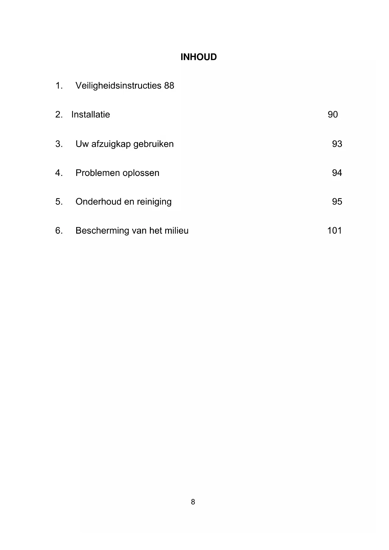 Deze handleiding geeft uitleg hoe u uw afzuigkap op de juiste wijze installeert en gebruikt. Lees de instructies aandachtig voordat u het apparaat gebruikt, zelfs als u met dit product vertrouwd bent. Bewaar de handleiding op een veilige plaats zodat u deze later kunt raadplegen. Het volgende mag u nooit doen: Probeer niet om de afzuigkap zonder de vetfilters te gebruiken, of als de filters bijzonder vettig zijn! Niet boven een fornuis installeren met een grill op hoog niveau. Laat geen frituurpannen onbeheerd tijdens gebruik; oververhit vet en olie zou vlam kunnen vatten. Voorkom open vuur onder de afzuigkap. Probeer niet om de afzuigkap toch te gebruiken als deze beschadigd is. Niet flamberen onder de afzuigkap. VOORZICHTIG: Bij gebruik van kooktoestellen kunnen toegankelijke delen heet worden. Houd de minimum afstand tussen het steunoppervlak voor kookgerei op het fornuis en de onderkant van de afzuigkap aan. (Wanneer de afzuigkap boven een gasfornuis is aangebracht, moet deze afstand ten minste 65 cm bedragen) De lucht mag niet worden afgevoerd via een kanaal dat wordt gebruikt voor uitlaatgassen van toestellen die gas of andere brandstoffen verbranden. Het volgende moet u altijd doen: Belangrijk! Schakel de netvoeding altijd uit tijdens installatie of onderhoud, bijvoorbeeld wanneer u een lampje moet vervangen. De afzuigkap moet worden geïnstalleerd in overeenstemming met de installatie-instructies en alle maten moeten worden aangehouden. Alle installatiewerkzaamheden moeten door een vakbekwame persoon of gekwalificeerde elektricien worden uitgevoerd. Voer de verpakking op de juiste manier af. Deze kan bij kinderen verwondingen veroorzaken. Let op voor scherpe randen binnenin in de afzuigkap, vooral tijdens het installeren en het schoonmaken. Wanneer de afzuigkap zich boven een gastoestel bevindt, moet de minimale afstand tussen het steunoppervlak voor kookgerei op het fornuis en de onderkant van de afzuigkap als volgt zijn: Gasfornuizen: 75 cm Elektrische fornuizen: 65 cm Fornuizen op kolen of olie: 75 cm Zorg ervoor dat de bochten in de buizen maximaal 90 graden zijn, omdat de afzuigkap anders minder efficiënt is. Waarschuwing: Wanneer de schroeven of de bevestiging niet volgens deze instructies zijn aangebracht, kan dit elektrische gevaren met zich meebrengen 88Het volgende moet u altijd doen