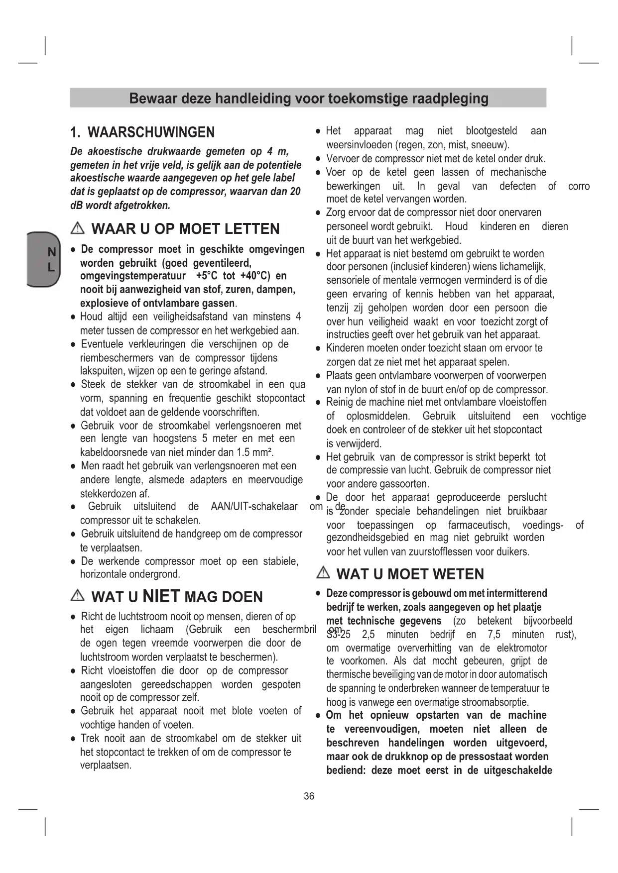 Houd altijd een veiligheidsafstand van minstens 4 metertussendecompressorenhetwerkgebiedaan. ● Eventuele verkleuringen die verschijnen op de riembeschermers van de compressor tijdens lakspuiten,wijzenopeentegeringeafstand. ● Steek de stekker van de stroomkabel in een qua vorm, spanning en frequentie geschikt stopcontact datvoldoetaandegeldendevoorschriften. ● Gebruik voor de stroomkabel verlengsnoeren met een lengte van hoogstens 5 meter en met een kabeldoorsnedevannietminderdan1.5mm². ● Men raadt het gebruik van verlengsnoeren met een andere lengte, alsmede adapters en meervoudige stekkerdozenaf. ● Gebruik uitsluitend de AAN/UIT-schakelaar om de compressoruitteschakelen. ● Gebruik uitsluitend de handgreep om de compressor teverplaatsen. ● De werkende compressor moet op een stabiele, horizontaleondergrond.