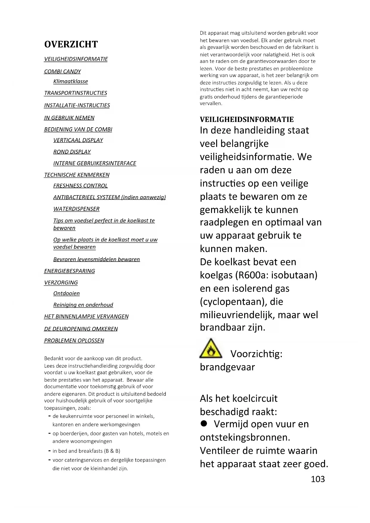Conformidade Ao colocar a marca neste produto, estamos a confirmar a conformidade com todos os requisitos de segurança, saúde e ambiente relevantes que são aplicáveis na legislação sobre este produto. GARANTIA A garantia mínima é: 2 anos para os países da UE, 3 anos para a Turquia, 1 ano para o Reino Unido, 1 ano para a Rússia, 3 anos para a Suécia, 2 anos para a Sérvia, 5 anos para a Noruega, 1 ano para Marrocos, 6 meses para a Argélia, Tunísia nenhuma garantia legal necessária.” DISPONIBILIDADE DE PEÇAS DE REPOSIÇÃO Termóstatos, sensores de temperatura, placas de circuito impresso e fontes de luz, por um período mínimo de sete anos após a colocação no mercado da última unidade do modelo em causa; pegas de porta, dobradiças de porta, tabuleiros e cestos por um período mínimo de sete anos e vedantes de porta por um período mínimo de dez anos, após a colocação no mercado da última unidade do modelo em causa Para mais informações sobre o produto, consulte https://eprel.ec.europa.eu/ ou digitalize o QR na etiqueta de energia fornecida com o aparelho103 Nederlands OVERZICHT VEILIGHEIDSINFORMATIE COMBI CANDY Klimaatklasse TRANSPORTINSTRUCTIES INSTALLATIE-INSTRUCTIES IN GEBRUIK NEMEN BEDIENING VAN DE COMBI VERTICAAL DISPLAY ROND DISPLAY INTERNE GEBRUIKERSINTERFACE TECHNISCHE KENMERKEN FRESHNESS CONTROL ANTIBACTERIEEL SYSTEEM (indien aanwezig) WATERDISPENSER Tips om voedsel perfect in de koelkast te bewaren Op welke plaats in de koelkast moet u uw voedsel bewaren Bevroren levensmiddelen bewaren ENERGIEBESPARING VERZORGING Ontdooien Reiniging en onderhoud HET BINNENLAMPJE VERVANGEN DE DEUROPENING OMKEREN PROBLEMEN OPLOSSEN Bedankt voor de aankoop van dit product. Lees deze instructiehandleiding zorgvuldig door voordat u uw koelkast gaat gebruiken, voor de beste prestaties van het apparaat. Bewaar alle documentatie voor toekomstig gebruik of voor andere eigenaren. Dit product is uitsluitend bedoeld voor huishoudelijk gebruik of voor soortgelijke toepassingen, zoals: - de keukenruimte voor personeel in winkels, kantoren en andere werkomgevingen - op boerderijen, door gasten van hotels, motels en andere woonomgevingen - in bed and breakfasts (B & B) - voor cateringservices en dergelijke toepassingen die niet voor de kleinhandel zijn. Dit apparaat mag uitsluitend worden gebruikt voor het bewaren van voedsel. Elk ander gebruik moet als gevaarlijk worden beschouwd en de fabrikant is niet verantwoordelijk voor nalatigheid. Het is ook aan te raden om de garantievoorwaarden door te lezen. Voor de beste prestaties en probleemloze werking van uw apparaat, is het zeer belangrijk om deze instructies zorgvuldig te lezen. Als u deze instructies niet in acht neemt, kan uw recht op gratis onderhoud tijdens de garantieperiode vervallen. VEILIGHEIDSINFORMATIE In deze handleiding staat veel belangrijke veiligheidsinformatie. We raden u aan om deze instructies op een veilige plaats te bewaren om ze gemakkelijk te kunnen raadplegen en optimaal van uw apparaat gebruik te kunnen maken. De koelkast bevat een koelgas (R600a: isobutaan) en een isolerend gas (cyclopentaan), die milieuvriendelijk, maar wel brandbaar zijn. Voorzichtig: brandgevaar Als het koelcircuit beschadigd raakt: Vermijd open vuur en ontstekingsbronnen. Ventileer de ruimte waarin het apparaat staat zeer goed.104