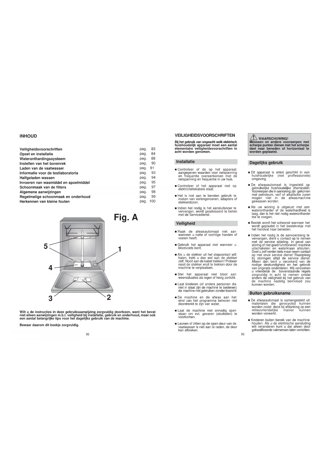 INHOUD VeiligheidsvoorschriftenOpzet en installatieWateronthardingssysteemInstellen van het bovenrekLaden van de vaatwasserInformatie voor de testlaboratoriaHalfgeladen wassenInvoeren van wasmiddel en spoelmiddelSchoonmaak van de filtersAlgemene aanwijzingenRegelmatige schoonmaak en onderhoudHerkennen van kleine foutenWilt u de instructies in deze gebruiksaanwijzing zorgvuldig doorlezen, want het bevatniet alleen aanwijzingen m.b.t. veiligheid bij installatie, gebruik en onderhoud, maar ookeen aantal belangrijke tips voor het dagelijks gebruik van de machine.Bewaar daarom dit boekje zorgvuldig. Fig. A