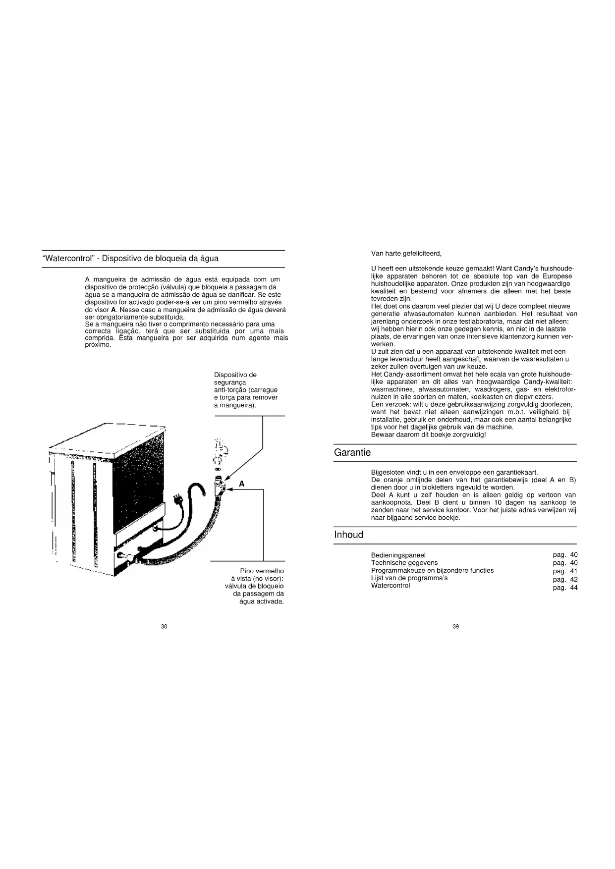 - •••• •• ••••3938 Van harte gefeliciteerd, U heeft een uitstekende keuze gemaakt! Want Candy’s huishoude- lijke apparaten behoren tot de absolute top van de Europese huishoudelijke apparaten. Onze produkten zijn van hoogwaardige kwaliteit en bestemd voor afnemers die alleen met het beste tevreden zijn. Het doet ons daarom veel plezier dat wij U deze compleet nieuwe generatie afwasautomaten kunnen aanbieden. Het resultaat van jarenlang onderzoek in onze testlaboratoria, maar dat niet alleen: wij hebben hierin ook onze gedegen kennis, en niet in de laatste plaats, de ervaringen van onze intensieve klantenzorg kunnen ver- werken. U zult zien dat u een apparaat van uitstekende kwaliteit met een lange levensduur heeft aangeschaft, waarvan de wasresultaten u zeker zullen overtuigen van uw keuze. Het Candy-assortiment omvat het hele scala van grote huishoude- lijke apparaten en dit alles van hoogwaardige Candy-kwaliteit: wasmachines, afwasautomaten, wasdrogers, gas- en elektrofor- nuizen in alle soorten en maten, koelkasten en diepvriezers. Een verzoek: wilt u deze gebruiksaanwijzing zorgvuldig doorlezen, want het bevat niet alleen aanwijzingen m.b.t. veiligheid bij installatie, gebruik en onderhoud, maar ook een aantal belangrijke tips voor het dagelijks gebruik van de machine. Bewaar daarom dit boekje zorgvuldig! Bijgesloten vindt u in een enveloppe een garantiekaart. De oranje omlijnde delen van het garantiebewijs (deel A en B) dienen door u in blokletters ingevuld te worden. Deel A kunt u zelf houden en is alleen geldig op vertoon van aankoopnota. Deel B dient u binnen 10 dagen na aankoop te zenden naar het service kantoor. Voor het juiste adres verwijzen wij naar bijgaand service boekje. Bedieningspaneel Technische gegevens Programmakeuze en bijzondere functies Lijst van de programma’s Watercontrol pag. 40 pag. 40 pag. 41 pag. 42 pag. 44 Garantie Inhoud A mangueira de admissão de água está equipada com um dispositivo de protecção (válvula) que bloqueia a passagam da água se a mangueira de admissão de água se danificar. Se este dispositivo for activado poder-se-á ver um pino vermelho através do visor A. Nesse caso a mangueira de admissão de água deverá ser obrigatoriamente substituída. Se a mangueira não tiver o comprimento necessário para uma correcta ligação, terá que ser substituida por uma mais comprida. Esta mangueira por ser adquirida num agente mais próximo. “Watercontrol” - Dispositivo de bloqueia da água Pino vermelho à vista (no visor): válvula de bloqueio da passagem da água activada. Dispositivo de segurança anti-torção (carregue e torça para remover a mangueira). AAttentie Deze vaatwasser is uitgevoerd met een “waterblock”, dit is een beveiliging tegen overstroming. Deze beveiliging werkt zelfs wanneer de machine is uitgeschakeld en stopt de water- toevoer als het niveau te hoog wordt door een eventuele storing. Belangrijk Om te voorkomen dat deze beveiliging onbe- doeld in werking treedt, is het aanbevolen de machine niet te verplaatsen of op te beuren terwijl deze in werking is. Als het nodig is de machine te verplaatsen of op te beuren, wacht dan tot het wasprogram- ma is afgelopen en het water uit de kuip is afgepompt. Programmakeuze en bijzondere funkties Om een programma in te stellen draait u de knop met de klok mee tot de wijzer het symbool van het gevraagde programma aangeeft, en drukt u vervolgens op de (Aan-Uit) knop. Controleer of de waterkraan open staat en de deur goed dicht zit. Toets halve lading Door deze toets in te drukken, is het mogelijk een kleine hoeveelheid servies af te wassen in alleen de bovenste korf. Het water-, energie- en wasmiddelverbruik is door het gebruik van deze toets aanzienlijk lager. Toets voor fijn glaswerk Door deze knop in te drukken en het programma, 5 in te stellen, draait de vaatwas- ser het programma voor kwetsbaar servie- sgoed op 45°C. Deze cyclus is aanbevolen voor kwetsbaar- of gedecoreerd serviesgoed en fijn glaswerk. Timer voor een vertraagde start De vertraagde start is mogelijk op alle programma’s. U kunt de start uitstellen tot maximaal 12 uur. Indien u deze optie wilt instellen, dient u de machine gewoon te laden, afwasmiddel toe te voegen en de programmaknop met de klok mee te draaien naar het gewenste aantal uren dat de machine later moet starten. Bijvoorbeeld: het is 8 uur ’s avonds en u wilt dat de machine om middernacht gaat draaien; draai de vertraagde start knop naar 4. Druk op de aan/uit toets. Het rode lichtje gaat branden ten teken dat de machine aan staat. De start van het programma wordt nu uitgesteld volgens de ingestelde tijd. N.B.: Wanneer u een hele korte vertraagde start instelt (1 of 2 uur), adviseren wij u de knop naar de laatste positie te draaien en deze vervolgens terug te draaien naar de gewenste tijd. Voorverwarming water voor snelle cyclus Om de snelle cyclus uit te voeren is het nood- zakelijk het water voor te verwarmen. U stelt de knop in op het symbool en drukt op de Aan-Uit toets. U dient deze eenvou- dige handeling zo n 15 minuten voor beëindi- ging van de maaltijd uit te voeren. Terwijl u eet neemt uw apparaat water en verwarmt dit voor. Wanneer de wijzer van de programmaknop op stop komt te staan, gaat het lampje “ ” branden: de machine is nu klaar om af te wassen. U schakelt de stroom weer uit door op de toets Aan-Uit te drukken. Open dan de deur, doe afwasmiddel in het bakje en laadt de machine met vuile vaat (plaats de vervuilde dingen niet te dicht op elkaar). Snelle cyclus: 18 minuten U zet de programmaknop op het betreffende symbool. Druk op de toets. Na ongeveer 18 minuten zal de cyclus beëindigd zijn. Druk weer op de toets en zet de deur op een kier om natuurlijke droging van de afwas te bevorderen.