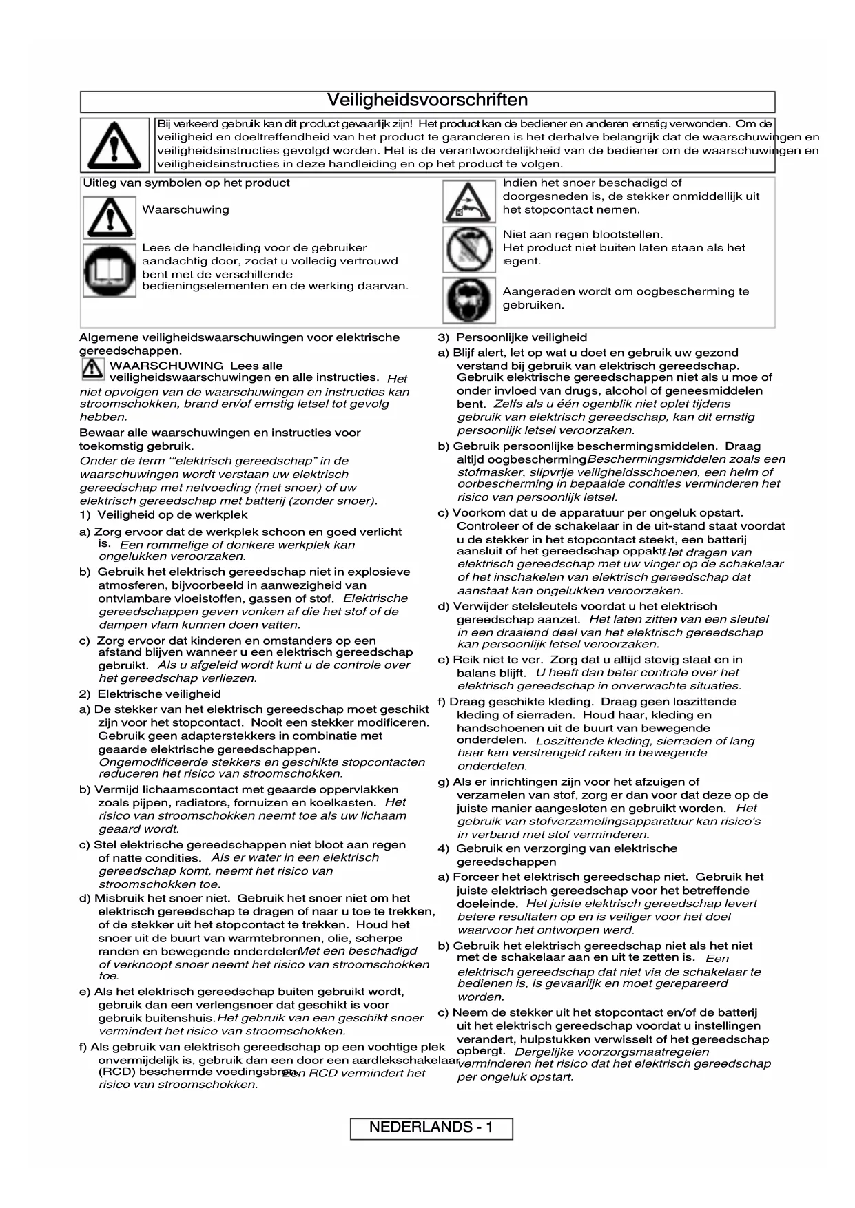 gereedschappen a) Forceer het elektrisch gereedschap niet. Gebruik het juiste elektrisch gereedschap voor het betreffende doeleinde. Het juiste elektrisch gereedschap levert betere resultaten op en is veiliger voor het doel waarvoor het ontworpen werd. b) Gebruik het elektrisch gereedschap niet als het niet met de schakelaar aan en uit te zetten is. Een elektrisch gereedschap dat niet via de schakelaar te bedienen is, is gevaarlijk en moet gerepareerd worden. c) Neem de stekker uit het stopcontact en/of de batterij uit het elektrisch gereedschap voordat u instellingen verandert, hulpstukken verwisselt of het gereedschap opbergt. Dergelijke voorzorgsmaatregelen verminderen het risico dat het elektrisch gereedschap per ongeluk opstart. Bij verkeerd gebruik kan dit product gevaarlijk zijn! Het product kan de bediener en anderen ernstig verwonden. Om de veiligheid en doeltreffendheid van het product te garanderen is het derhalve belangrijk dat de waarschuwingen en veiligheidsinstructies gevolgd worden. Het is de verantwoordelijkheid van de bediener om de waarschuwingen en veiligheidsinstructies in deze handleiding en op het product te volgen. NEDERLANDS - 1 Uitleg van symbolen op het product Waarschuwing Lees de handleiding voor de gebruiker