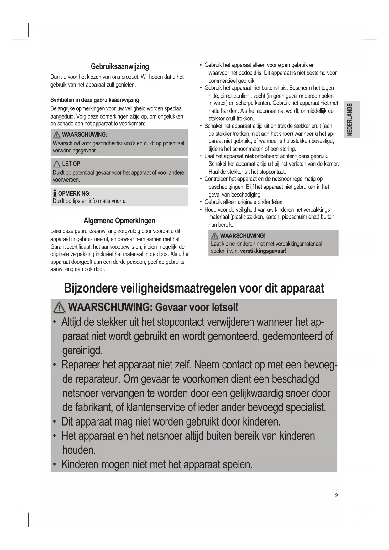 - Houd voor de veiligheid van uw kinderen het verpakkings- materiaal (plastic zakken, karton, piepschuim enz.) buiten hun bereik. WAARSCHUWING! Laat kleine kinderen niet met verpakkingsmateriaal spelen i.v.m. verstikkingsgevaar! Bijzondere veiligheidsmaatregelen voor dit apparaat WAARSCHUWING: Gevaar voor letsel!