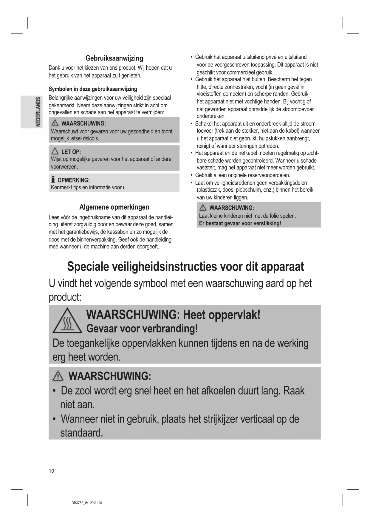 - Kies een lage temperatuur voor nabehandelde stoffen en strijk ze binnenstebuiten. OPMERKING: Het strijkijzer warmt sneller op dan het afkoelt. Begin te strijken op de laagste temperatuurinstelling.DB3752_IM 29.01.20
