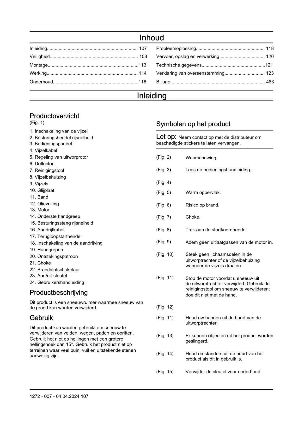 Productbeschrijving Dit product is een sneeuwruimer waarmee sneeuw van de grond kan worden verwijderd. Gebruik Dit product kan worden gebruikt om sneeuw te verwijderen van velden, wegen, paden en opritten. Gebruik het niet op hellingen met een grotere hellingshoek dan 15°. Gebruik het product niet op terreinen waar veel puin, vuil en uitstekende stenen aanwezig zijn. Symbolen op het product Let op: Neem contact op met de distributeur om beschadigde stickers te laten vervangen. (Fig. 2) Waarschuwing. (Fig. 3) Lees de bedieningshandleiding. (Fig. 4) (Fig. 5) Warm oppervlak. (Fig. 6) Risico op brand. (Fig. 7) Choke. (Fig. 8) Trek aan de startkoordhendel. (Fig. 9) Adem geen uitlaatgassen van de motor in. (Fig. 10) Steek geen lichaamsdelen in de uitworptrechter of de vijzelbehuizing wanneer de vijzels draaien. (Fig. 11) Stop de motor voordat u sneeuw uit de uitworptrechter verwijdert. Gebruik de reinigingstool om sneeuw te verwijderen; doe dit niet met de hand. (Fig. 12) (Fig. 11) Houd uw handen uit de buurt van de uitworptrechter. (Fig. 13) Er kunnen objecten uit het product worden geslingerd. (Fig. 14) Houd omstanders uit de buurt van het product als dit in gebruik is. (Fig. 15) Verwijder de sleutel voor onderhoud. 1272 - 007 - 04.04.2024 107(Fig. 16) Zet de aan/uit-sleutel in de stand RUN. (Fig. 17) Zet de brandstofschakelaar in de stand AAN. (Fig. 18) Druk op de primerbalg. (Fig. 19) Valrisico. (Fig. 20) Beweeg langzaam naar achteren. (Fig. 21) Draag goedgekeurde veiligheidshandschoenen. (Fig. 22) Draag een veiligheidshelm. Gebruik goedgekeurde gehoorbescherming. Gebruik goedgekeurde oogbescherming. (Fig. 23) Geluidsemissies naar de omgeving volgens de Europese richtlijn 2000/14/EG en de wetgeving van Nieuw-Zuid-Wales "Protection of the Environment Operations (Noise Control) Regulation 2017". De geluidsemissiegegevens vindt u op het machinelabel en in het hoofdstuk Technische gegevens. (Fig. 24) Dit product voldoet aan de geldende EG- richtlijnen. (Fig. 25) Dit product voldoet aan de geldende VK- regelgeving. Let op: Andere symbolen/stickers op het product hebben betrekking op certificeringseisen voor bepaalde markten. Euro V-emissies WAARSCHUWING: De EU- typegoedkeuring van dit product vervalt als ongeoorloofde wijzigingen aan de motor aangebracht worden. Fabrikant Husqvarna AB Drottninggatan 2, SE-561 82 Huskvarna Schade aan het product We zijn niet verantwoordelijk voor schade aan ons product als: