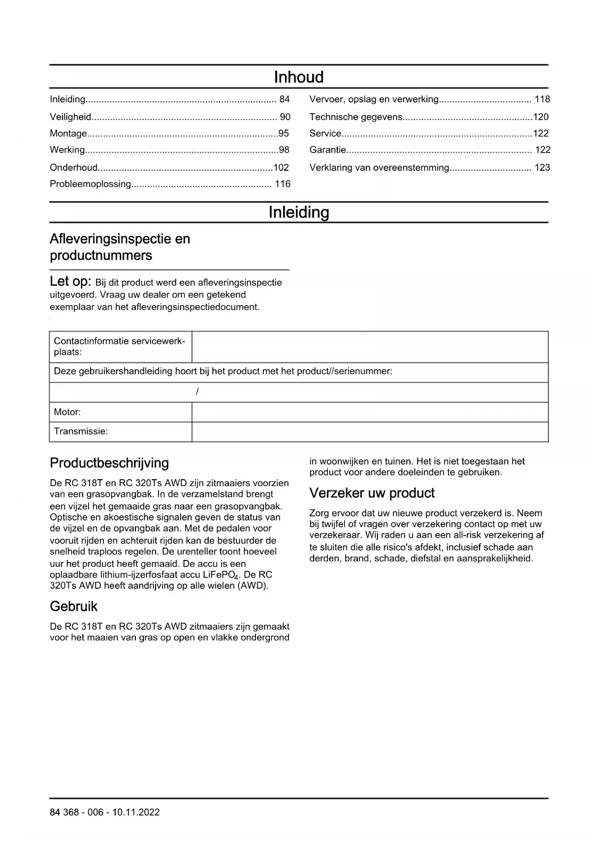 . De RC 320Ts AWD heeft aandrijving op alle wielen (AWD). Gebruik De RC 318T en RC 320Ts AWD zitmaaiers zijn gemaakt voor het maaien van gras op open en vlakke ondergrond in woonwijken en tuinen. Het is niet toegestaan het product voor andere doeleinden te gebruiken. Verzeker uw product Zorg ervoor dat uw nieuwe product verzekerd is. Neem bij twijfel of vragen over verzekering contact op met uw verzekeraar. Wij raden u aan een all-risk verzekering af te sluiten die alle risico's afdekt, inclusief schade aan derden, brand, schade, diefstal en aansprakelijkheid. 84 368 - 006 - 10.11.2022Productoverzicht