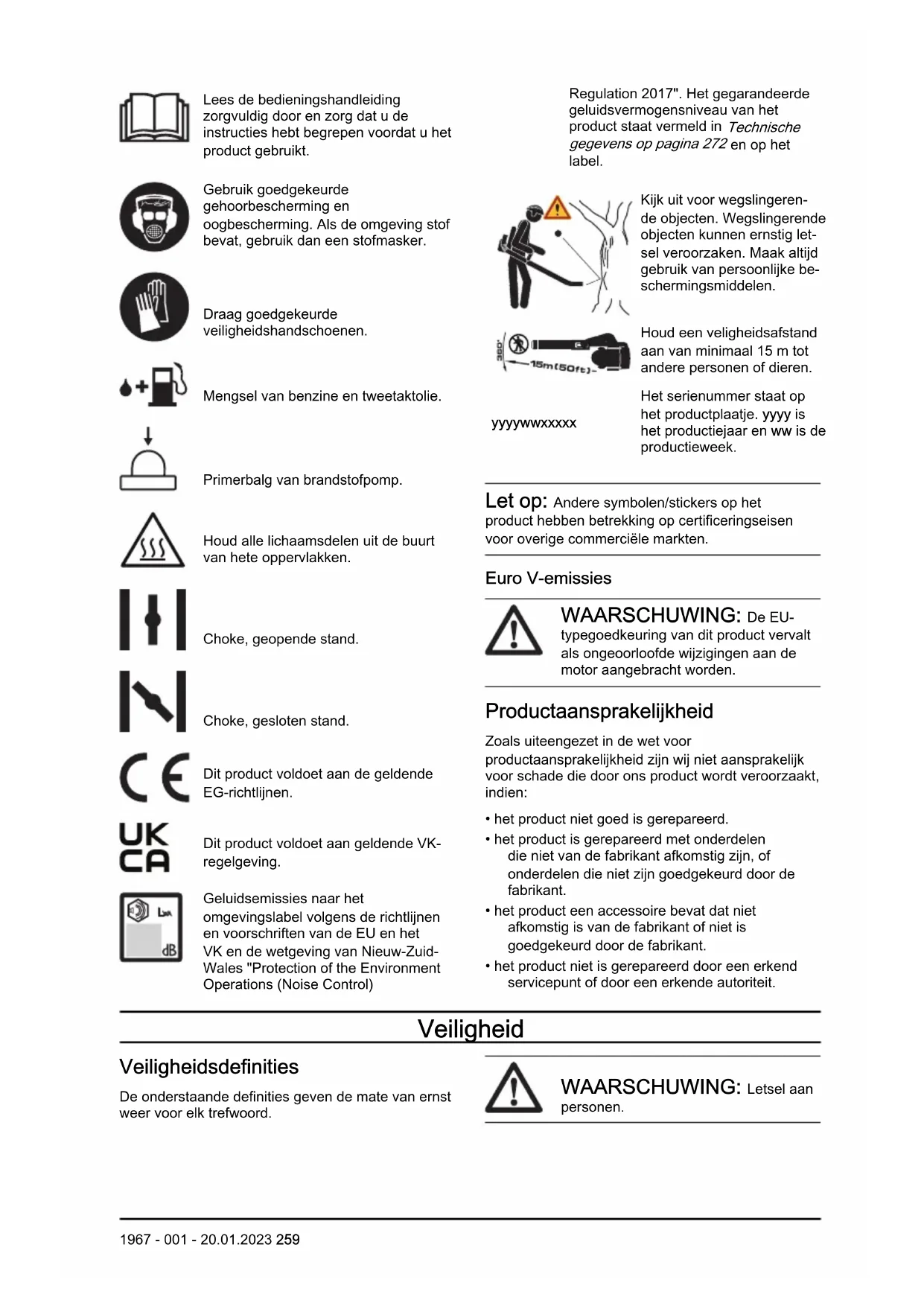 Symbolen op het product WAARSCHUWING! Dit product kan gevaarlijk zijn en ernstig of fataal letsel toebrengen aan de gebruiker of anderen. Wees voorzichtig en gebruik het product op de juiste manier. 258 1967 - 001 - 20.01.2023Lees de bedieningshandleiding zorgvuldig door en zorg dat u de instructies hebt begrepen voordat u het product gebruikt. Gebruik goedgekeurde gehoorbescherming en oogbescherming. Als de omgeving stof bevat, gebruik dan een stofmasker. Draag goedgekeurde veiligheidshandschoenen. Mengsel van benzine en tweetaktolie. Primerbalg van brandstofpomp. Houd alle lichaamsdelen uit de buurt van hete oppervlakken. Choke, geopende stand. Choke, gesloten stand. Dit product voldoet aan de geldende EG-richtlijnen. Dit product voldoet aan geldende VK- regelgeving. Geluidsemissies naar het omgevingslabel volgens de richtlijnen en voorschriften van de EU en het VK en de wetgeving van Nieuw-Zuid- Wales "Protection of the Environment Operations (Noise Control) Regulation 2017". Het gegarandeerde geluidsvermogensniveau van het product staat vermeld in Technische gegevens op pagina 272 en op het label. Kijk uit voor wegslingeren- de objecten. Wegslingerende objecten kunnen ernstig let- sel veroorzaken. Maak altijd gebruik van persoonlijke be- schermingsmiddelen. Houd een veligheidsafstand aan van minimaal 15 m tot andere personen of dieren. yyyywwxxxxx Het serienummer staat op het productplaatje. yyyy is het productiejaar en ww is de productieweek. Let op: Andere symbolen/stickers op het product hebben betrekking op certificeringseisen voor overige commerciële markten. Euro V-emissies WAARSCHUWING: De EU- typegoedkeuring van dit product vervalt als ongeoorloofde wijzigingen aan de motor aangebracht worden. Productaansprakelijkheid Zoals uiteengezet in de wet voor productaansprakelijkheid zijn wij niet aansprakelijk voor schade die door ons product wordt veroorzaakt, indien: