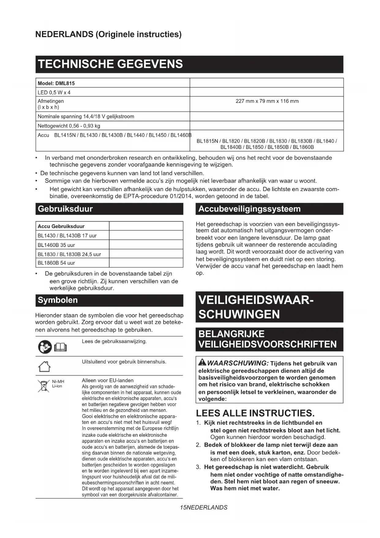 - Degebruiksdurenindebovenstaandetabelzijn eengroverichtlijn.Zijkunnenverschillenvande werkelijkegebruiksduur. Symbolen Hieronderstaandesymbolendievoorhetgereedschap wordengebruikt.Zorgervoordatuweetwatzebeteke- nenalvorenshetgereedschaptegebruiken. Leesdegebruiksaanwijzing.Uitsluitendvoorgebruikbinnenshuis. Ni-MH Li-ionAlleenvoorEU-landenAlsgevolgvandeaanwezigheidvanschade-lijkecomponenteninhetapparaat,kunnenoudeelektrische en elektronische apparaten, accu‘s enbatterijennegatievegevolgenhebbenvoorhet milieu en de gezondheid van mensen.Gooi elektrische en elektronische appara-tenenaccu‘snietmethethuisvuilweg!InovereenstemmingmetdeEuropeserichtlijninzake oude elektrische en elektronische apparateneninzakeaccu‘senbatterijenenoudeaccu‘senbatterijen,alsmededetoepas-singdaarvanbinnendenationalewetgeving,dienen oude elektrische apparaten, accu‘s en batterijengescheidentewordenopgeslagenentewordeningeleverdbijeenapartinzame-lingspuntvoorhuishoudelijkafvaldatdemili-eubeschermingsvoorschrifteninachtneemt.Dit wordt op het apparaat aangegeven door het symboolvaneendoorgekruisteafvalcontainer. Accubeveiligingssysteem Hetgereedschapisvoorzienvaneenbeveiligingssys- teem dat automatisch het uitgangsvermogen onder- breektvooreenlangerelevensduur.Delampgaat tijdensgebruikuitwanneerderesterendeacculading laag wordt. Dit wordt veroorzaakt door de activering van hetbeveiligingssysteemenduidtnietopeenstoring. Verwijderdeaccuvanafhetgereedschapenlaadthem op. VEILIGHEIDSWAAR- SCHUWINGEN BELANGRIJKE VEILIGHEIDSVOORSCHRIFTEN WAARSCHUWING: Tijdens het gebruik van elektrische gereedschappen dienen altijd de basisveiligheidsvoorzorgen te worden genomen om het risico van brand, elektrische schokken en persoonlijk letsel te verkleinen, waaronder de volgende: LEES ALLE INSTRUCTIES.