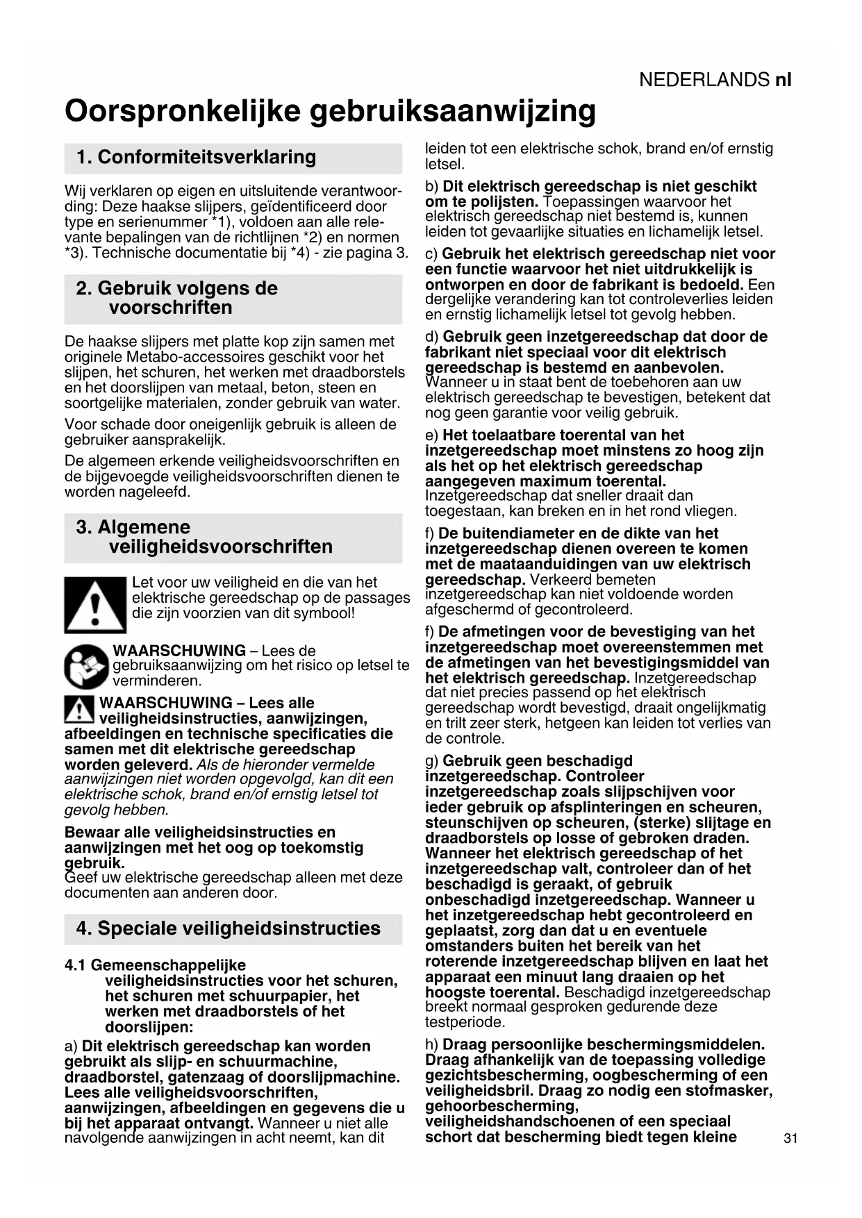 Oorspronkelijke gebruiksaanwijzing Wij verklaren op eigen en uitsluitende verantwoor- ding: Deze haakse slijpers, geïdentificeerd door type en serienummer *1), voldoen aan alle rele- vante bepalingen van de richtlijnen *2) en normen *3). Technische documentatie bij *4) - zie pagina 3. De haakse slijpers met platte kop zijn samen met originele Metabo-accessoires geschikt voor het slijpen, het schuren, het werken met draadborstels en het doorslijpen van metaal, beton, steen en soortgelijke materialen, zonder gebruik van water. Voor schade door oneigenlijk gebruik is alleen de gebruiker aansprakelijk. De algemeen erkende veiligheidsvoorschriften en de bijgevoegde veiligheidsvoorschriften dienen te worden nageleefd. Let voor uw veiligheid en die van het elektrische gereedschap op de passages die zijn voorzien van dit symbool! WAARSCHUWING – Lees de gebruiksaanwijzing om het risico op letsel te verminderen. WAARSCHUWING – Lees alle veiligheidsinstructies, aanwijzingen, afbeeldingen en technische specificaties die samen met dit elektrische gereedschap worden geleverd. Als de hieronder vermelde aanwijzingen niet worden opgevolgd, kan dit een elektrische schok, brand en/of ernstig letsel tot gevolg hebben. Bewaar alle veiligheidsinstructies en aanwijzingen met het oog op toekomstig gebruik. Geef uw elektrische gereedschap alleen met deze documenten aan anderen door.