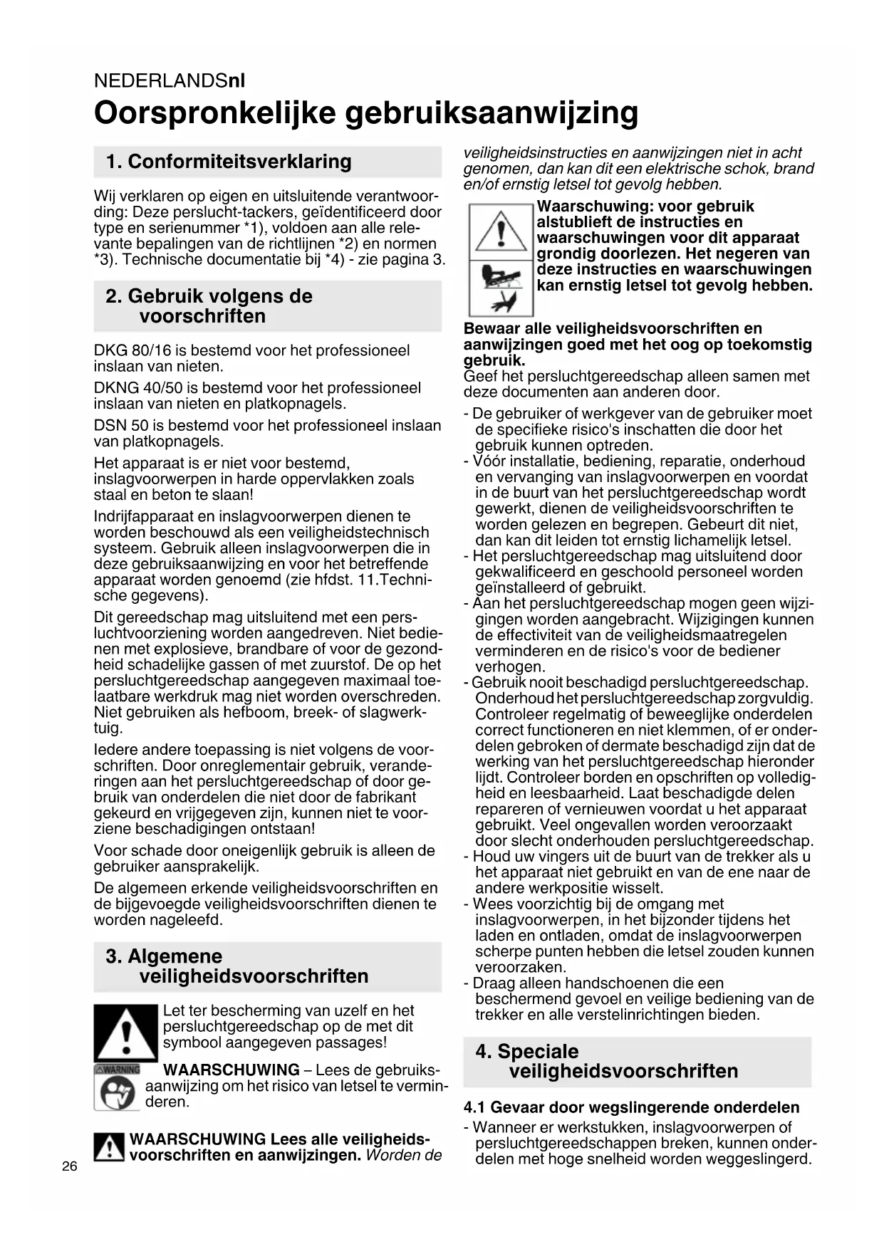 Oorspronkelijke gebruiksaanwijzing Wij verklaren op eigen en uitsluitende verantwoor- ding: Deze perslucht-tackers, geïdentificeerd door type en serienummer *1), voldoen aan alle rele- vante bepalingen van de richtlijnen *2) en normen *3). Technische documentatie bij *4) - zie pagina 3. DKG 80/16 is bestemd voor het professioneel inslaan van nieten. DKNG 40/50 is bestemd voor het professioneel inslaan van nieten en platkopnagels. DSN 50 is bestemd voor het professioneel inslaan van platkopnagels. Het apparaat is er niet voor bestemd, inslagvoorwerpen in harde oppervlakken zoals staal en beton te slaan! Indrijfapparaat en inslagvoorwerpen dienen te worden beschouwd als een veiligheidstechnisch systeem. Gebruik alleen inslagvoorwerpen die in deze gebruiksaanwijzing en voor het betreffende apparaat worden genoemd (zie hfdst. 11.Techni- sche gegevens). Dit gereedschap mag uitsluitend met een pers- luchtvoorziening worden aangedreven. Niet bedie- nen met explosieve, brandbare of voor de gezond- heid schadelijke gassen of met zuurstof. De op het persluchtgereedschap aangegeven maximaal toe- laatbare werkdruk mag niet worden overschreden. Niet gebruiken als hefboom, breek- of slagwerk- tuig. Iedere andere toepassing is niet volgens de voor- schriften. Door onreglementair gebruik, verande- ringen aan het persluchtgereedschap of door ge- bruik van onderdelen die niet door de fabrikant gekeurd en vrijgegeven zijn, kunnen niet te voor- ziene beschadigingen ontstaan! Voor schade door oneigenlijk gebruik is alleen de gebruiker aansprakelijk. De algemeen erkende veiligheidsvoorschriften en de bijgevoegde veiligheidsvoorschriften dienen te worden nageleefd. Let ter bescherming van uzelf en het persluchtgereedschap op de met dit symbool aangegeven passages! WAARSCHUWING – Lees de gebruiks- aanwijzing om het risico van letsel te vermin- deren. WAARSCHUWING Lees alle veiligheids- voorschriften en aanwijzingen. Worden de veiligheidsinstructies en aanwijzingen niet in acht genomen, dan kan dit een elektrische schok, brand en/of ernstig letsel tot gevolg hebben. Waarschuwing: voor gebruik alstublieft de instructies en waarschuwingen voor dit apparaat grondig doorlezen. Het negeren van deze instructies en waarschuwingen kan ernstig letsel tot gevolg hebben. Bewaar alle veiligheidsvoorschriften en aanwijzingen goed met het oog op toekomstig gebruik. Geef het persluchtgereedschap alleen samen met deze documenten aan anderen door. - De gebruiker of werkgever van de gebruiker moet de specifieke risico's inschatten die door het gebruik kunnen optreden. - Vóór installatie, bediening, reparatie, onderhoud en vervanging van inslagvoorwerpen en voordat in de buurt van het persluchtgereedschap wordt gewerkt, dienen de veiligheidsvoorschriften te worden gelezen en begrepen. Gebeurt dit niet, dan kan dit leiden tot ernstig lichamelijk letsel. - Het persluchtgereedschap mag uitsluitend door gekwalificeerd en geschoold personeel worden geïnstalleerd of gebruikt. - Aan het persluchtgereedschap mogen geen wijzi- gingen worden aangebracht. Wijzigingen kunnen de effectiviteit van de veiligheidsmaatregelen verminderen en de risico's voor de bediener verhogen. - Gebruik nooit beschadigd persluchtgereedschap. Onderhoud het persluchtgereedschap zorgvuldig. Controleer regelmatig of beweeglijke onderdelen correct functioneren en niet klemmen, of er onder- delen gebroken of dermate beschadigd zijn dat de werking van het persluchtgereedschap hieronder lijdt. Controleer borden en opschriften op volledig- heid en leesbaarheid. Laat beschadigde delen repareren of vernieuwen voordat u het apparaat gebruikt. Veel ongevallen worden veroorzaakt door slecht onderhouden persluchtgereedschap. - Houd uw vingers uit de buurt van de trekker als u het apparaat niet gebruikt en van de ene naar de andere werkpositie wisselt. - Wees voorzichtig bij de omgang met inslagvoorwerpen, in het bijzonder tijdens het laden en ontladen, omdat de inslagvoorwerpen scherpe punten hebben die letsel zouden kunnen veroorzaken. - Draag alleen handschoenen die een beschermend gevoel en veilige bediening van de trekker en alle verstelinrichtingen bieden.