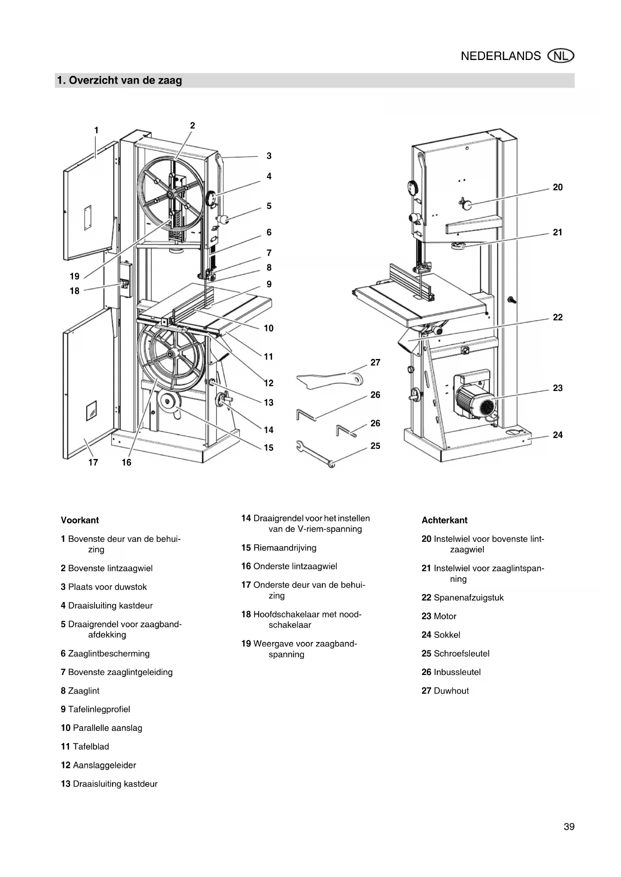 Voorkant 1 Bovenste deur van de behui- zing 2 Bovenste lintzaagwiel 3 Plaats voor duwstok 4 Draaisluiting kastdeur 5 Draaigrendel voor zaagband- afdekking 6 Zaaglintbescherming 7 Bovenste zaaglintgeleiding 8 Zaaglint 9 Tafelinlegprofiel 10 Parallelle aanslag 11 Tafelblad 12 Aanslaggeleider 13 Draaisluiting kastdeur 14 Draaigrendel voor het instellen van de V-riem-spanning 15 Riemaandrijving 16 Onderste lintzaagwiel 17 Onderste deur van de behui- zing 18 Hoofdschakelaar met nood- schakelaar 19 Weergave voor zaagband- spanning Achterkant 20 Instelwiel voor bovenste lint- zaagwiel 21 Instelwiel voor zaaglintspan- ning 22 Spanenafzuigstuk 23 Motor 24 Sokkel 25 Schroefsleutel 26 Inbussleutel 27 Duwhout XA0046H6.fm Origineel gebruikaanwijzing DEUTSCH40 NEDERLANDS