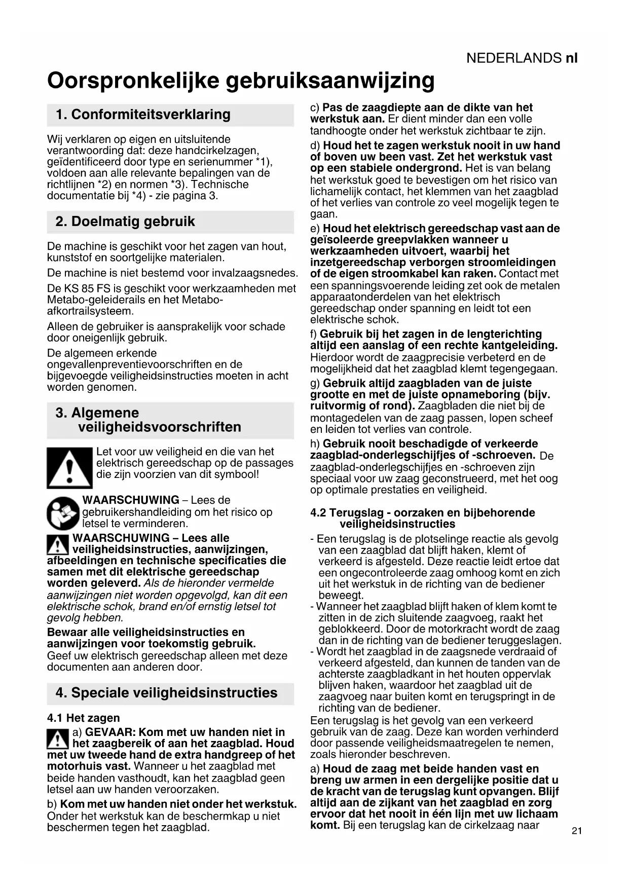 Oorspronkelijke gebruiksaanwijzing Wij verklaren op eigen en uitsluitende verantwoording dat: deze handcirkelzagen, geïdentificeerd door type en serienummer *1), voldoen aan alle relevante bepalingen van de richtlijnen *2) en normen *3). Technische documentatie bij *4) - zie pagina 3. De machine is geschikt voor het zagen van hout, kunststof en soortgelijke materialen. De machine is niet bestemd voor invalzaagsnedes. De KS 85 FS is geschikt voor werkzaamheden met Metabo-geleiderails en het Metabo- afkortrailsysteem. Alleen de gebruiker is aansprakelijk voor schade door oneigenlijk gebruik. De algemeen erkende ongevallenpreventievoorschriften en de bijgevoegde veiligheidsinstructies moeten in acht worden genomen. Let voor uw veiligheid en die van het elektrisch gereedschap op de passages die zijn voorzien van dit symbool! WAARSCHUWING – Lees de gebruikershandleiding om het risico op letsel te verminderen. WAARSCHUWING – Lees alle veiligheidsinstructies, aanwijzingen, afbeeldingen en technische specificaties die samen met dit elektrische gereedschap worden geleverd. Als de hieronder vermelde aanwijzingen niet worden opgevolgd, kan dit een elektrische schok, brand en/of ernstig letsel tot gevolg hebben. Bewaar alle veiligheidsinstructies en aanwijzingen voor toekomstig gebruik. Geef uw elektrisch gereedschap alleen met deze documenten aan anderen door.