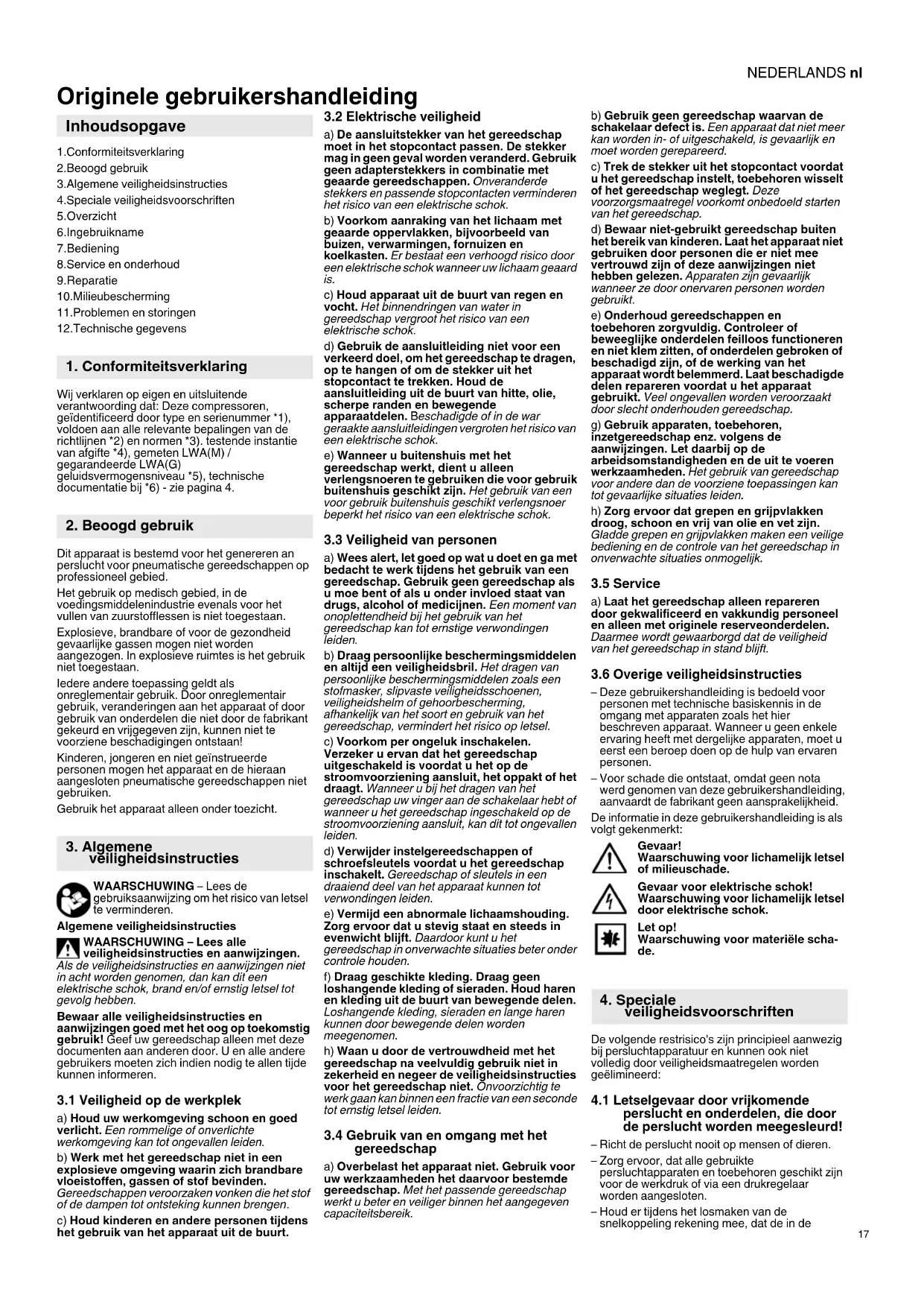 Originele gebruikershandleiding 1.Conformiteitsverklaring 2.Beoogd gebruik 3.Algemene veiligheidsinstructies 4.Speciale veiligheidsvoorschriften 5.Overzicht 6.Ingebruikname 7.Bediening 8.Service en onderhoud 9.Reparatie 10.Milieubescherming 11.Problemen en storingen 12.Technische gegevens Wij verklaren op eigen en uitsluitende verantwoording dat: Deze compressoren, geïdentificeerd door type en serienummer *1), voldoen aan alle relevante bepalingen van de richtlijnen *2) en normen *3). testende instantie van afgifte *4), gemeten LWA(M) / gegarandeerde LWA(G) geluidsvermogensniveau *5), technische documentatie bij *6) - zie pagina 4. Dit apparaat is bestemd voor het genereren an perslucht voor pneumatische gereedschappen op professioneel gebied. Het gebruik op medisch gebied, in de voedingsmiddelenindustrie evenals voor het vullen van zuurstofflessen is niet toegestaan. Explosieve, brandbare of voor de gezondheid gevaarlijke gassen mogen niet worden aangezogen. In explosieve ruimtes is het gebruik niet toegestaan. Iedere andere toepassing geldt als onreglementair gebruik. Door onreglementair gebruik, veranderingen aan het apparaat of door gebruik van onderdelen die niet door de fabrikant gekeurd en vrijgegeven zijn, kunnen niet te voorziene beschadigingen ontstaan! Kinderen, jongeren en niet geïnstrueerde personen mogen het apparaat en de hieraan aangesloten pneumatische gereedschappen niet gebruiken. Gebruik het apparaat alleen onder toezicht. WAARSCHUWING – Lees de gebruiksaanwijzing om het risico van letsel te verminderen. Algemene veiligheidsinstructies WAARSCHUWING – Lees alle veiligheidsinstructies en aanwijzingen. Als de veiligheidsinstructies en aanwijzingen niet in acht worden genomen, dan kan dit een elektrische schok, brand en/of ernstig letsel tot gevolg hebben. Bewaar alle veiligheidsinstructies en aanwijzingen goed met het oog op toekomstig gebruik! Geef uw gereedschap alleen met deze documenten aan anderen door. U en alle andere gebruikers moeten zich indien nodig te allen tijde kunnen informeren.