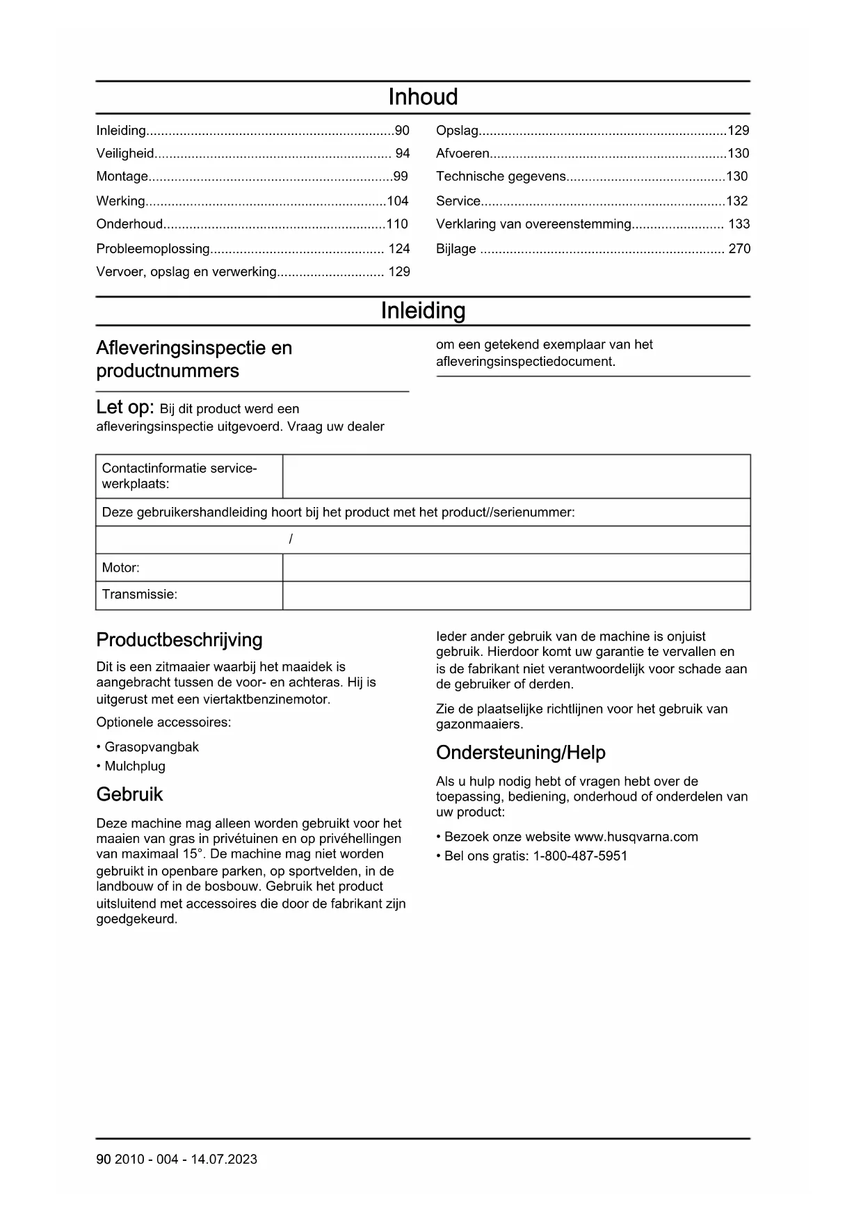 - Mulchplug Gebruik Deze machine mag alleen worden gebruikt voor het maaien van gras in privétuinen en op privéhellingen van maximaal 15°. De machine mag niet worden gebruikt in openbare parken, op sportvelden, in de landbouw of in de bosbouw. Gebruik het product uitsluitend met accessoires die door de fabrikant zijn goedgekeurd. Ieder ander gebruik van de machine is onjuist gebruik. Hierdoor komt uw garantie te vervallen en is de fabrikant niet verantwoordelijk voor schade aan de gebruiker of derden. Zie de plaatselijke richtlijnen voor het gebruik van gazonmaaiers. Ondersteuning/Help Als u hulp nodig hebt of vragen hebt over de toepassing, bediening, onderhoud of onderdelen van uw product: