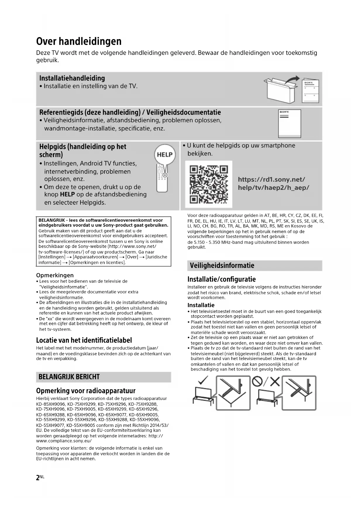 - Lees voor het bedienen van de televisie de "Veiligheidsinformatie".• Lees de meegeleverde documentatie voor extra veiligheidsinformatie.• De afbeeldingen en illustraties die in de installatiehandleiding en de handleiding worden gebruikt, gelden uitsluitend als referentie en kunnen van het actuele product afwijken.• De "xx" die wordt weergegeven in de modelnaam komt overeen met een cijfer dat betrekking heeft op het ontwerp, de kleur of het tv-systeem. Locatie van het identificatielabel Het label met het modelnummer, de productiedatum (jaar/maand) en de voedingsklasse bevinden zich op de achterkant van de tv en verpakking. BELANGRIJK BERICHT Opmerking voor radioapparatuur Hierbij verklaart Sony Corporation dat de types radioapparatuur KD-85XH9096, KD-75XH9299, KD-75XH9296, KD-75XH9288, KD-75XH9096, KD-75XH9005, KD-65XH9299, KD-65XH9296, KD-65XH9288, KD-65XH9096, KD-65XH9077, KD-65XH9005, KD-55XH9299, KD-55XH9296, KD-55XH9288, KD-55XH9096, KD-55XH9077, KD-55XH9005 conform zijn met Richtlijn 2014/53/EU. De volledige tekst van de EU-conformiteitsverklaring kan worden geraadpleegd op het volgende internetadres: http://www.compliance.sony.eu/Opmerking voor klanten: de volgende informatie is enkel van toepassing voor apparaten die verkocht worden in landen die de EU-richtlijnen in acht nemen.Voor deze radioapparatuur gelden in AT, BE, HR, CY, CZ, DK, EE, FI, FR, DE, EL, HU, IE, IT, LV, LT, LU, MT, NL, PL, PT, SK, SI, ES, SE, UK, IS, LI, NO, CH, BG, RO, TR, AL, BA, MK, MD, RS, ME en Kosovo de volgende beperkingen op het in gebruik nemen of op de voorschriften voor toestemming tot het gebruik :de 5.150 - 5.350 MHz-band mag uitsluitend binnen worden gebruikt. Veiligheidsinformatie Installatie/configuratie Installeer en gebruik de televisie volgens de instructies hieronder zodat het risico van brand, elektrische schok, schade en/of letsel wordt voorkomen. Installatie