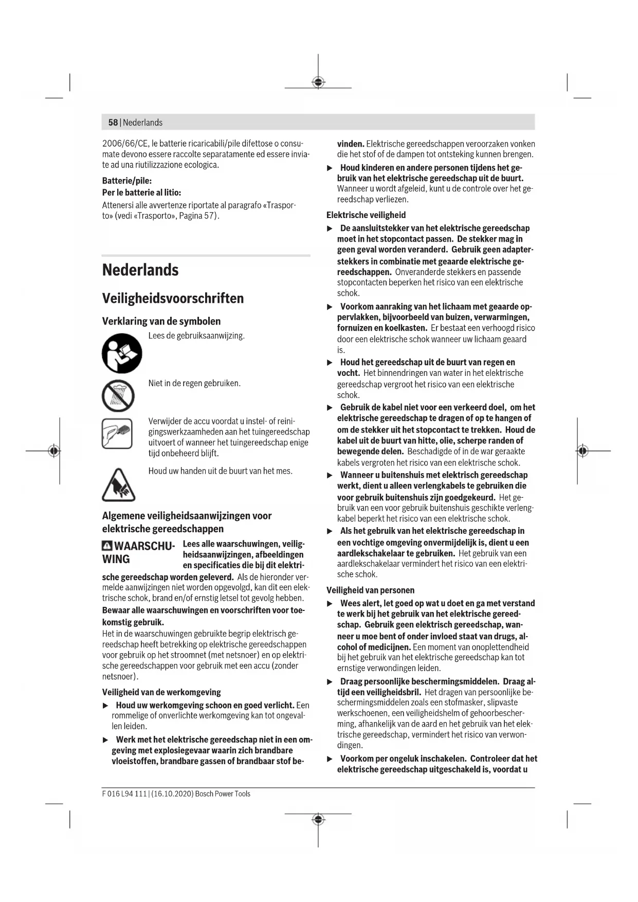 1,5 Il/I valore/i complessivo/i delle oscillazioni indicato/i e il va- lore/i di emissione acustica indicato/i sono stati misurati se- condo una procedura di controllo standardizzata e possono essere utilizzati per il confronto di un elettroutensile con un altro. Il/I valore/i complessivo/i delle oscillazioni indicato/i e il va- lore/i di emissione acustica indicato/i possono essere utiliz- zati anche per una valutazione temporanea della sollecitazio- ne. Durante l'effettivo impiego dell'elettroutensile le emissioni di oscillazioni e le emissioni acustiche possono differire dai va- lori dei dati indicati in funzione del modo in cui l'elettrouten- sile viene impiegato e in modo particolare dal tipo di pezzo da lavorare; e – per la necessità di definire misure di sicurez- za per la protezione dell'operatore, che si basano su una va- lutazione della sollecitazione da vibrazioni durante le effetti- ve condizioni di impiego (a riguardo devono essere tenute presenti tutte le parti del ciclo operativo, ad esempio i tempi in cui l'elettroutensile è spento e quelli in cui lo stesso è ac- ceso ma funziona senza sollecitazione). Messa in funzione Per la Vostra sicurezza u Attenzione: Prima di effettuare interventi di regola- zione o pulizia spegnere l’apparecchio per il giardinag- gio ed estrarre sempre la batteria ricaricabile. u Una volta spenta la tagliasiepi, le lame continuano a muoversi ancora per poche frazioni di secondi. u Mai toccare le lame in movimento. Ricarica della batteria u Osservare la tensione di rete! La tensione della rete elettrica di alimentazione deve corrispondere ai dati ri- portati sulla targhetta di identificazione della stazione di ricarica. La batteria ricaricabile è dotata di un controllo della tempe- ratura che consente una ricarica esclusivamente nel campo di temperatura tra 0 °C e 35 °C. In questo modo viene otte- nuta un’elevata durata della batteria ricaricabile. Nota: La batteria ricaricabile viene fornita parzialmente cari- ca. Per garantire l’intera potenza della batteria ricaricabile, prima del primo impiego ricaricare completamente la batte- ria ricaricabile nella stazione di ricarica. La batteria ricaricabile agli ioni di litio può essere ricaricata in qualsiasi momento senza ridurne la durata. Un’interruzio- ne dell’operazione di ricarica non danneggia la batteria rica- ricabile. La batteria ricaricabile agli ioni di litio è protetta dalla "Elec- tronic Cell Protection (ECP)" contro lo scaricamento comple- to. In caso di batteria scarica, il prodotto viene spento trami- te un interruttore automatico: L’apparecchio per il giardinag- gio non funziona più. Dopo lo spegnimento automatico del prodotto non pre- mere ulteriormente l’interruttore di avvio/arresto. La batteria ricaricabile potrebbe subire dei danni. Attenersi alle indicazioni per lo smaltimento della batteria ri- caricabile. Inserimento/rimozione della batteria ricaricabile (vedi figuraB) Nota: Se non vengono utilizzate batterie ricaricabili adatte possono verificarsi funzionamenti difettosi o è possibile il danneggiamento dell’apparecchio. Inserire la batteria carica (9). Assicurarsi che la batteria rica- ricabile sia inserita completamente. Per la rimozione della batteria ricaricabile (9) dall’apparec- chio premere il tasto di sbloccaggio batteria ricaricabile (8) e togliere la batteria. Operazione di ricarica L’operazione di ricarica inizia non appena la spina di rete del- la stazione di ricarica viene inserita nella presa e la batteria ricaricabile (9) viene inserita nella stazione di ricarica (7). Grazie all’intelligente procedimento di ricarica lo stato di ri- carica della batteria viene riconosciuto automaticamente e, in base alla temperatura della batteria e della tensione, viene selezionata la corrente di carica ottimale. In questo modo la batteria ricaricabile viene protetta e con- servandola nella stazione di ricarica rimane sempre comple- tamente carica. F 016 L94 111 | (16.10.2020) Bosch Power ToolsItaliano | 55 Significato degli elementi di visualizzazione (AL1815CV) Luce lampeggiante indicatore di carica della batteria Il processo di ricarica viene segnalato tramite il lampeggiamento dell’indicatore di carica della batteria . Luce continua indicatore di carica della batteria Full La luce continua dell’indicatore di carica della batteria segnala che la batteria ricaricabile è completamente carica oppure che la temperatura della bat- teria ricaricabile si trova al di fuori del campo della tempera- tura di ricarica ammesso e che per questo motivo non può essere ricaricata. Non appena viene raggiunto il campo di temperatura ammesso, la batteria ricaricabile viene ricarica- ta. Se la batteria ricaricabile non è inserita, la luce continua dell’indicatore di carica della batteria segnala che la spina di rete è inserita nella presa di corrente e che la stazione di ri- carica è pronta per l’uso. Significato degli elementi indicatori (AL1830CV) Luce lampeggiante (veloce) indicatore di carica della batteria verde Il processo di ricarica rapida viene segnalato dal lampeggio veloce dell’indicatore di carica della batteria verde . Nota bene: L’operazione di ricarica rapida è possibile esclu- sivamente se la temperatura della batteria ricaricabile si tro- va nel campo di temperatura di carica ammissibile, vedi pa- ragrafo "Dati tecnici". Luce lampeggiante (lenta) indicatore di carica della batteria verde Con uno stato di carica della batteria ricarica- bile di ca. 80% l’indicatore di carica verde lampeggia lentamente. La batteria ricaricabile può essere presa ed utilizzata imme- diatamente. Led indicatore di carica della batteria di colore verde e con luce fissa Full La luce fissa dell’indicatore di carica della batteria di colore verde segnala che la batte- ria è completamente carica. Senza batteria inserita, la luce fissa dell’indicatore di carica della batteria , segnala che il connettore di rete è inserito nella presta e che il carica