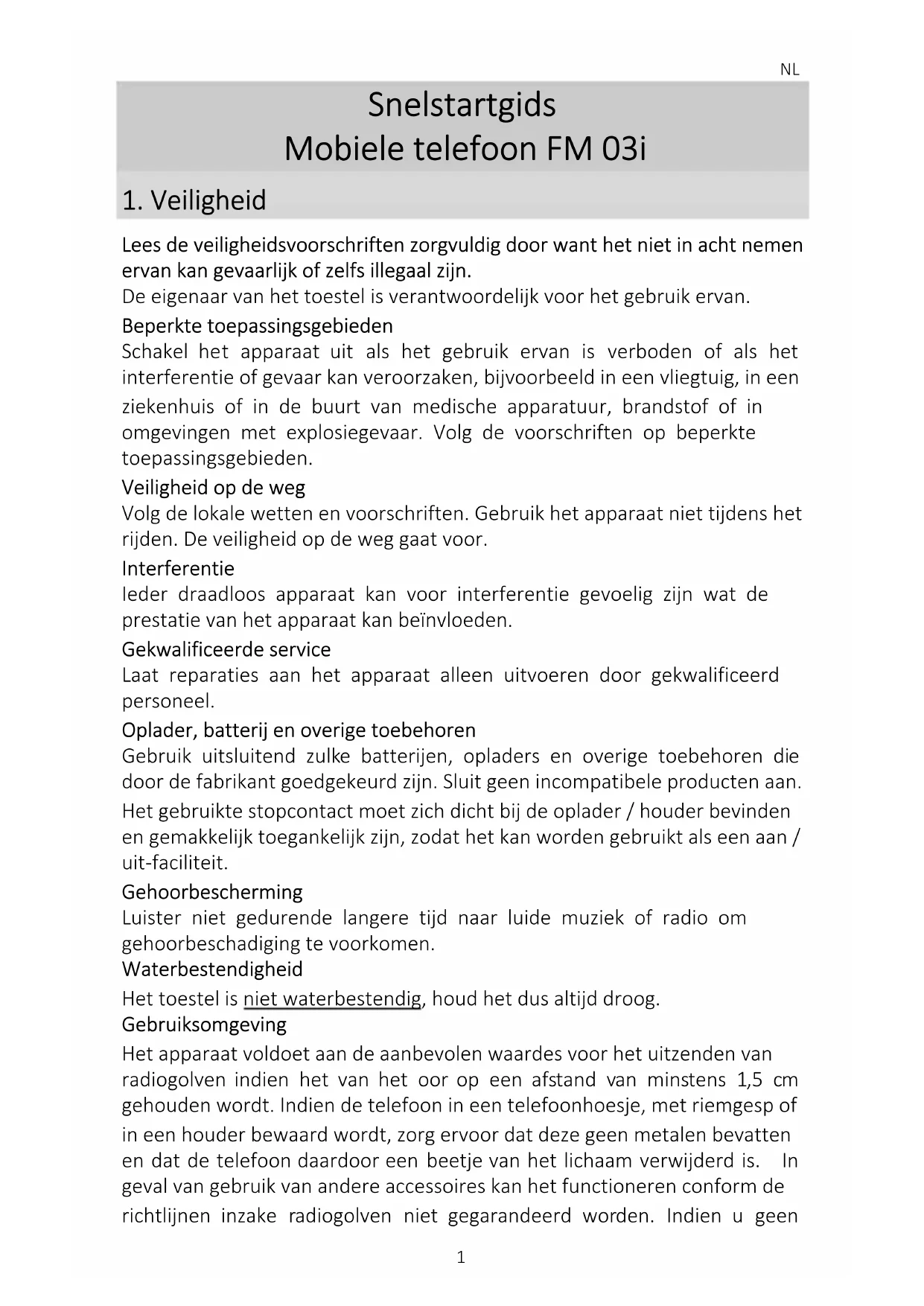 Lees de veiligheidsvoorschriften zorgvuldig door want het niet in acht nemen ervan kan gevaarlijk of zelfs illegaal zijn. De eigenaar van het toestel is verantwoordelijk voor het gebruik ervan. Beperkte toepassingsgebieden Schakel het apparaat uit als het gebruik ervan is verboden of als het interferentie of gevaar kan veroorzaken, bijvoorbeeld in een vliegtuig, in een ziekenhuis of in de buurt van medische apparatuur, brandstof of in omgevingen met explosiegevaar. Volg de voorschriften op beperkte toepassingsgebieden. Veiligheid op de weg Volg de lokale wetten en voorschriften. Gebruik het apparaat niet tijdens het rijden. De veiligheid op de weg gaat voor. Interferentie Ieder draadloos apparaat kan voor interferentie gevoelig zijn wat de prestatie van het apparaat kan beïnvloeden. Gekwalificeerde service Laat reparaties aan het apparaat alleen uitvoeren door gekwalificeerd personeel. Oplader, batterij en overige toebehoren Gebruik uitsluitend zulke batterijen, opladers en overige toebehoren die door de fabrikant goedgekeurd zijn. Sluit geen incompatibele producten aan. Het gebruikte stopcontact moet zich dicht bij de oplader / houder bevinden en gemakkelijk toegankelijk zijn, zodat het kan worden gebruikt als een aan / uit-faciliteit. Gehoorbescherming Luister niet gedurende langere tijd naar luide muziek of radio om gehoorbeschadiging te voorkomen. Waterbestendigheid Het toestel is niet waterbestendig, houd het dus altijd droog. Gebruiksomgeving Het apparaat voldoet aan de aanbevolen waardes voor het uitzenden van radiogolven indien het van het oor op een afstand van minstens 1,5 cm gehouden wordt. Indien de telefoon in een telefoonhoesje, met riemgesp of in een houder bewaard wordt, zorg ervoor dat deze geen metalen bevatten en dat de telefoon daardoor een beetje van het lichaam verwijderd is. In geval van gebruik van andere accessoires kan het functioneren conform de richtlijnen inzake radiogolven niet gegarandeerd worden. Indien u geenNL