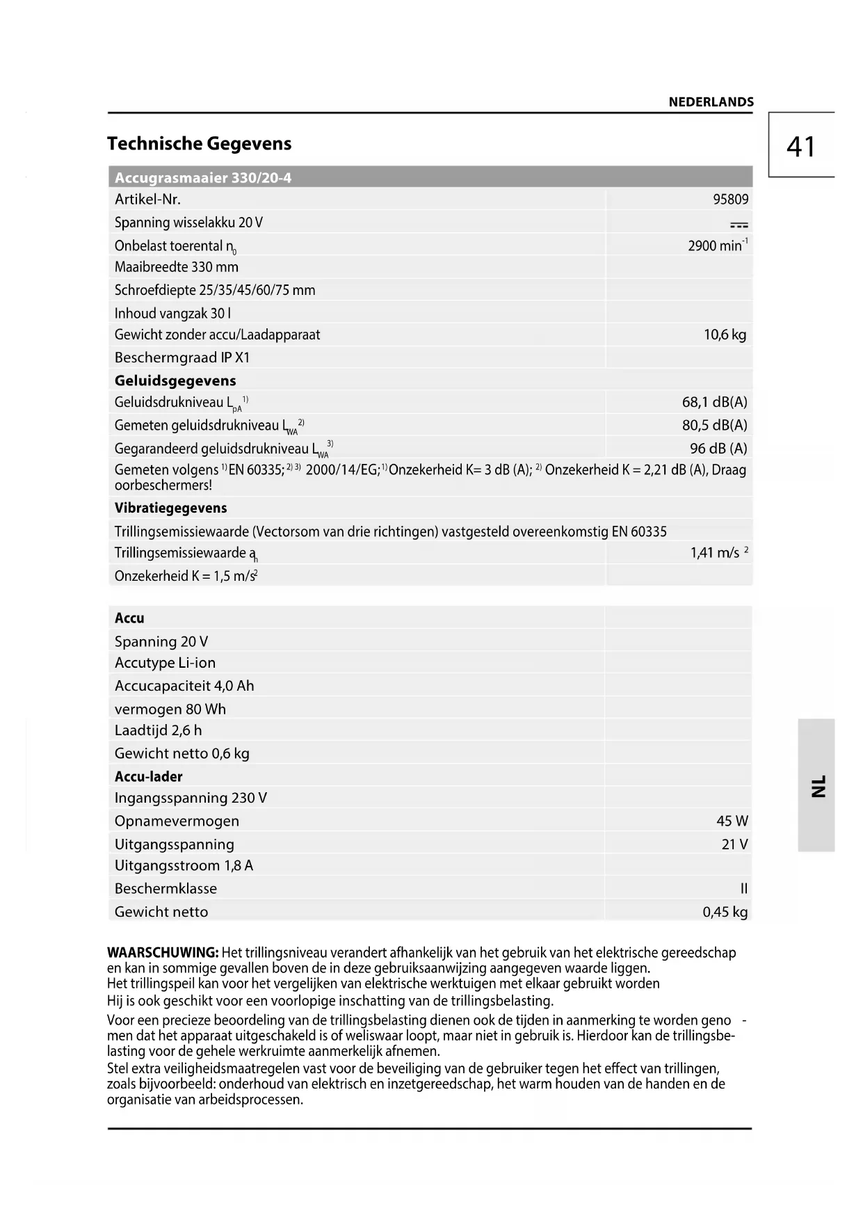 Accu Spanning 20 V Accutype Li-ion Accucapaciteit 4,0 Ah vermogen 80 Wh Laadtijd 2,6 h Gewicht netto 0,6 kg Accu-lader Ingangsspanning 230 V Opnamevermogen 45 W Uitgangsspanning 21 V Uitgangsstroom 1,8 A Beschermklasse II Gewicht netto 0,45 kg WAARSCHUWING: Het trillingsniveau verandert afhankelijk van het gebruik van het elektrische gereedschap en kan in sommige gevallen boven de in deze gebruiksaanwijzing aangegeven waarde liggen. Het trillingspeil kan voor het vergelijken van elektrische werktuigen met elkaar gebruikt worden Hij is ook geschikt voor een voorlopige inschatting van de trillingsbelasting. Voor een precieze beoordeling van de trillingsbelastingdienen ook de tijden in aanmerking te wordengeno