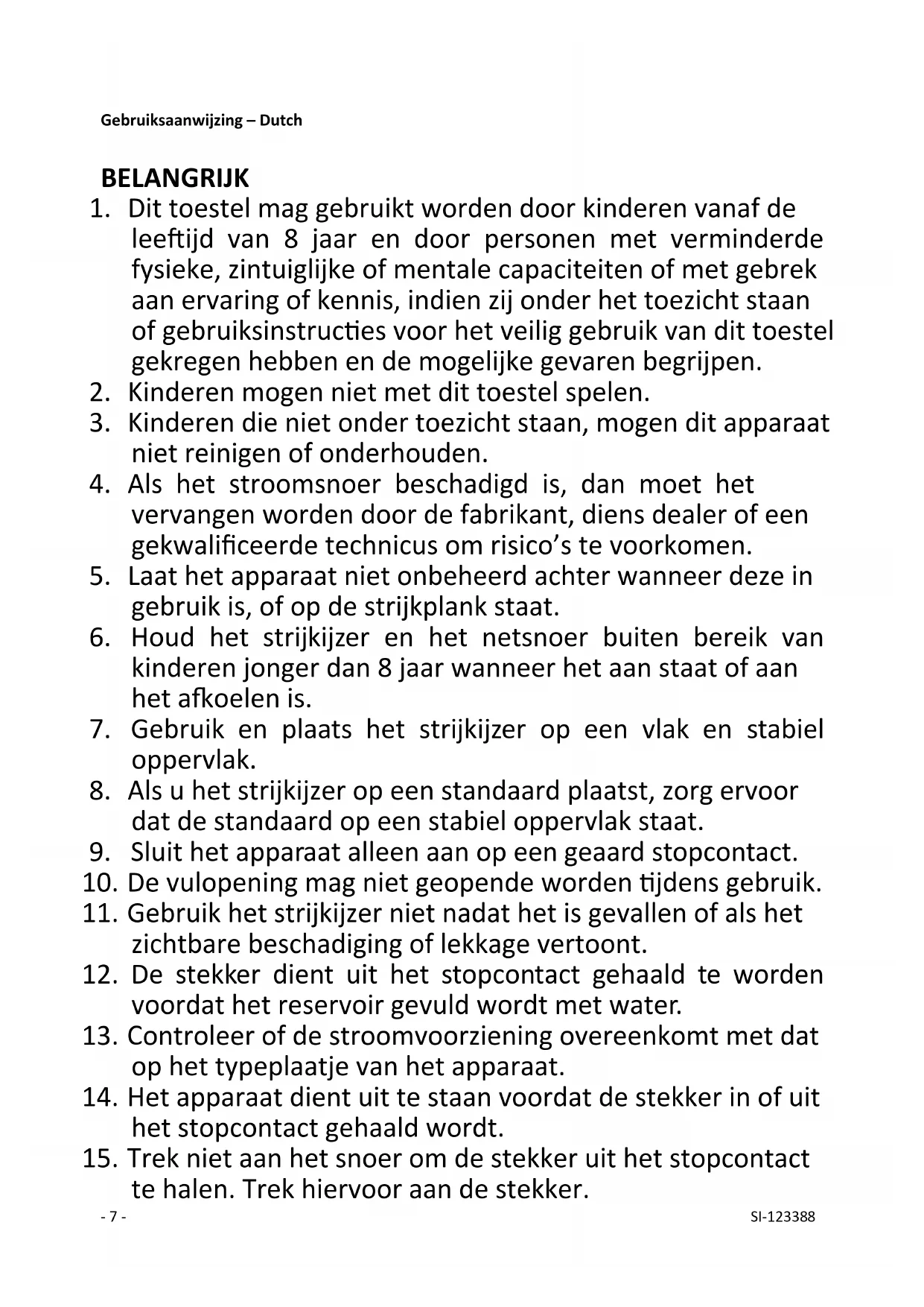 wijze beschadigd of wanneer de kabel of de stekker beschadigd zijn. In het geval van schade, neemt het apparaat een elektrische reparatiewerkplaats voor onderzoek en reparatie indien nodig.- 9 - SI-123388