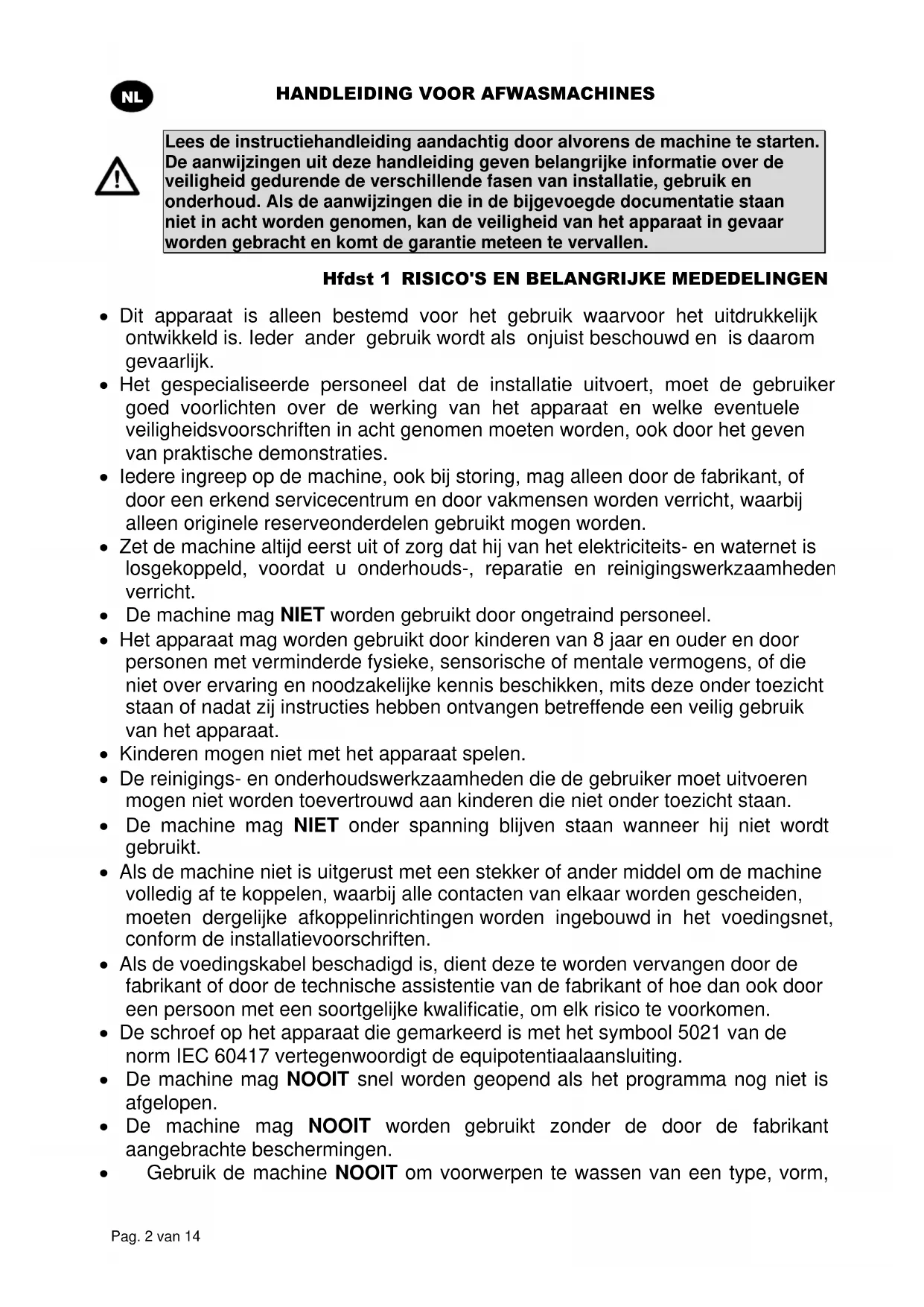 Lees de instructiehandleiding aandachtig door alvorens de machine te starten. De aanwijzingen uit deze handleiding geven belangrijke informatie over de veiligheid gedurende de verschillende fasen van installatie, gebruik en onderhoud. Als de aanwijzingen die in de bijgevoegde documentatie staan niet in acht worden genomen, kan de veiligheid van het apparaat in gevaar worden gebracht en komt de garantie meteen te vervallen. Hfdst 1 RISICO'S EN BELANGRIJKE MEDEDELINGEN Dit apparaat is alleen bestemd voor het gebruik waarvoor het uitdrukkelijk ontwikkeld is. Ieder ander gebruik wordt als onjuist beschouwd en is daarom gevaarlijk. Het gespecialiseerde personeel dat de installatie uitvoert, moet de gebruiker goed voorlichten over de werking van het apparaat en welke eventuele veiligheidsvoorschriften in acht genomen moeten worden, ook door het geven van praktische demonstraties. Iedere ingreep op de machine, ook bij storing, mag alleen door de fabrikant, of door een erkend servicecentrum en door vakmensen worden verricht, waarbij alleen originele reserveonderdelen gebruikt mogen worden. Zet de machine altijd eerst uit of zorg dat hij van het elektriciteits- en waternet is losgekoppeld, voordat u onderhouds-, reparatie en reinigingswerkzaamheden verricht. De machine mag NIET worden gebruikt door ongetraind personeel. Het apparaat mag worden gebruikt door kinderen van 8 jaar en ouder en door personen met verminderde fysieke, sensorische of mentale vermogens, of die niet over ervaring en noodzakelijke kennis beschikken, mits deze onder toezicht staan of nadat zij instructies hebben ontvangen betreffende een veilig gebruik van het apparaat. Kinderen mogen niet met het apparaat spelen. De reinigings- en onderhoudswerkzaamheden die de gebruiker moet uitvoeren mogen niet worden toevertrouwd aan kinderen die niet onder toezicht staan. De machine mag NIET onder spanning blijven staan wanneer hij niet wordt gebruikt. Als de machine niet is uitgerust met een stekker of ander middel om de machine volledig af te koppelen, waarbij alle contacten van elkaar worden gescheiden, moeten dergelijke afkoppelinrichtingen worden ingebouwd in het voedingsnet, conform de installatievoorschriften. Als de voedingskabel beschadigd is, dient deze te worden vervangen door de fabrikant of door de technische assistentie van de fabrikant of hoe dan ook door een persoon met een soortgelijke kwalificatie, om elk risico te voorkomen. De schroef op het apparaat die gemarkeerd is met het symbool 5021 van de norm IEC 60417 vertegenwoordigt de equipotentiaalaansluiting. De machine mag NOOIT snel worden geopend als het programma nog niet is afgelopen. De machine mag NOOIT worden gebruikt zonder de door de fabrikant aangebrachte beschermingen. Gebruik de machine NOOIT om voorwerpen te wassen van een type, vorm,HANDLEIDING VOOR AFWASMACHINES Pag. 3 van 14