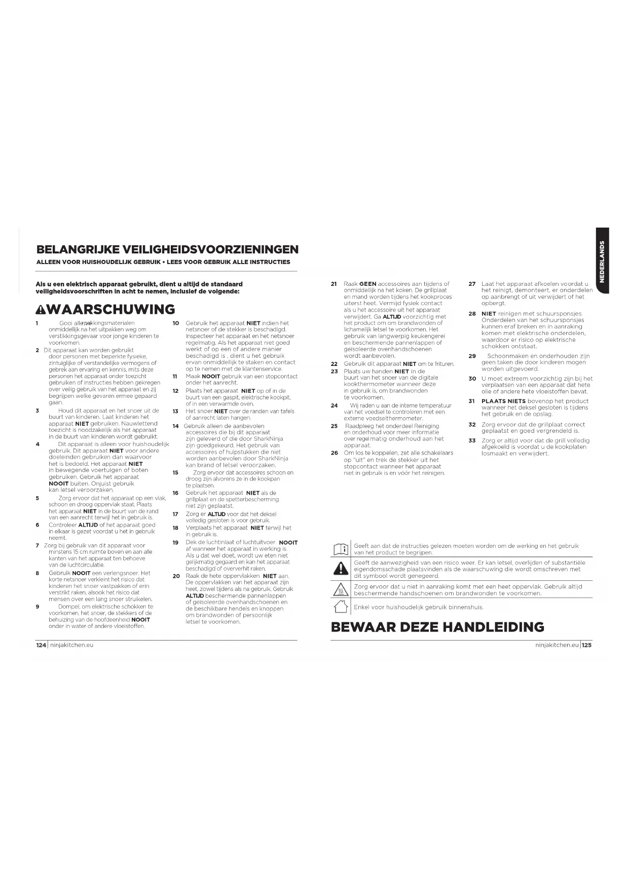 ninjakitchen.eu Scan de QR-code met een mobiel apparaat NEDERLANDSBELANGRIJKE VEILIGHEIDSVOORZIENINGEN ALLEEN VOOR HUISHOUDELIJK GEBRUIK • LEES VOOR GEBRUIK ALLE INSTRUCTIES Als u een elektrisch apparaat gebruikt, dient u altijd de standaard veiligheidsvoorschriften in acht te nemen, inclusief de volgende: WAARSCHUWING 1 Gooi alle ve rpakkingsmaterialen onmiddellijk na het uitpakken weg om verstikkingsgevaar voor jonge kinderen te voorkomen. 2 Dit apparaat kan worden gebruikt door personen met beperkte fysieke, zintuiglijke of verstandelijke vermogens of gebrek aan ervaring en kennis, mits deze personen het apparaat onder toezicht gebruiken of instructies hebben gekregen over veilig gebruik van het apparaat en zij begrijpen welke gevaren ermee gepaard gaan. 3 Houd dit apparaat en het snoer uit de buurt van kinderen. Laat kinderen het apparaat NIET gebruiken. Nauwlettend toezicht is noodzakelijk als het apparaat in de buurt van kinderen wordt gebruikt. 4 Dit apparaat is alleen voor huishoudelijk gebruik. Dit apparaat NIET voor andere doeleinden gebruiken dan waarvoor het is bedoeld. Het apparaat NIET in bewegende voertuigen of boten gebruiken. Gebruik het apparaat NOOIT buiten. Onjuist gebruik kan letsel veroorzaken. 5 Zorg ervoor dat het apparaat op een vlak, schoon en droog oppervlak staat. Plaats het apparaat NIET in de buurt van de rand van een aanrecht terwijl het in gebruik is. 6 Controleer ALTIJD of het apparaat goed in elkaar is gezet voordat u het in gebruik neemt. 7 Zorg bij gebruik van dit apparaat voor minstens 15 cm ruimte boven en aan alle kanten van het apparaat ten behoeve van de luchtcirculatie.