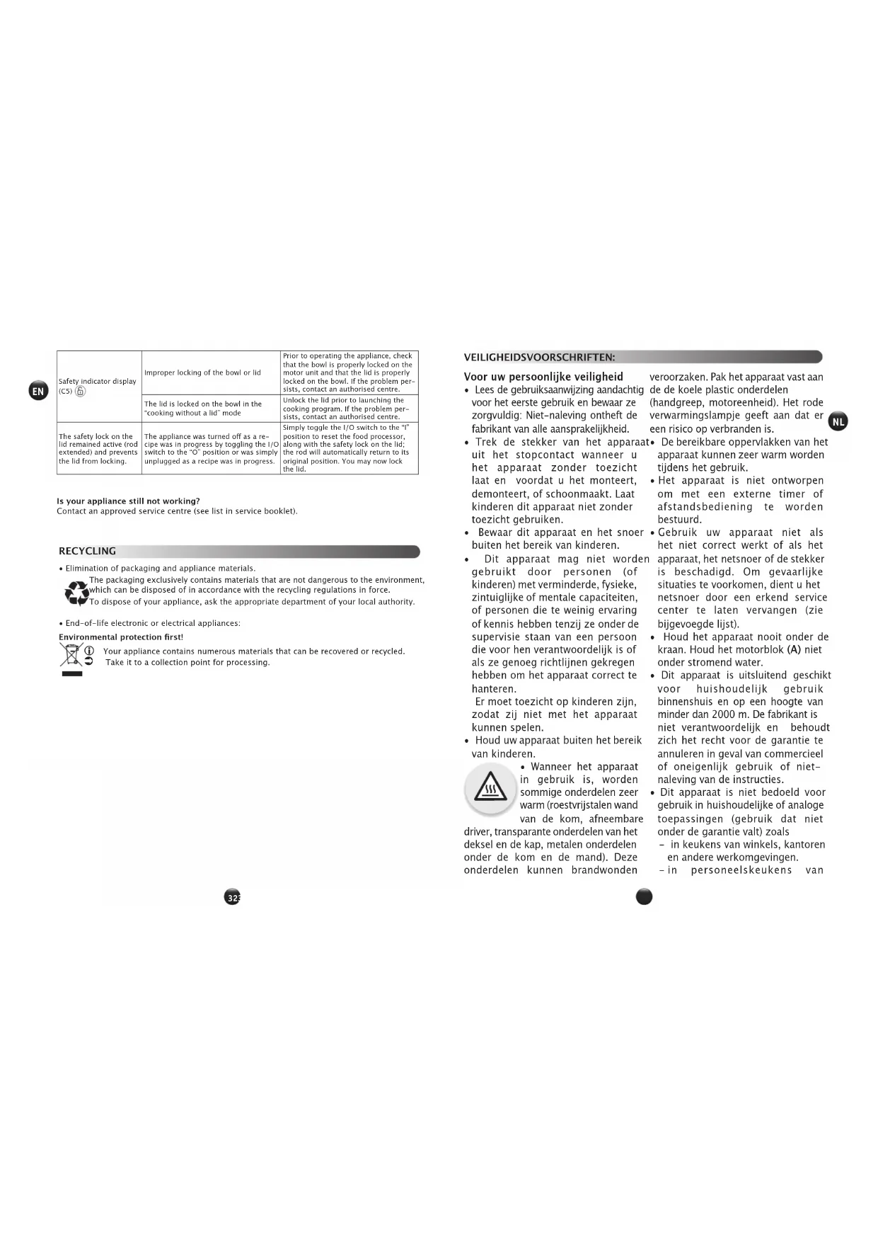| Weergave van verglichtedlampje (CS) | Slechte vergrendeling van de kom of het deksel | Alvorens het apparaat te active-ren,lient u te controlleren of dekom correct vergrendel is op de motorblok en of het deksel cor-rect vergrendel is op de kom. Als het probleem blijft aanhouden, neemt u contact op met een er-kend centrum. |
