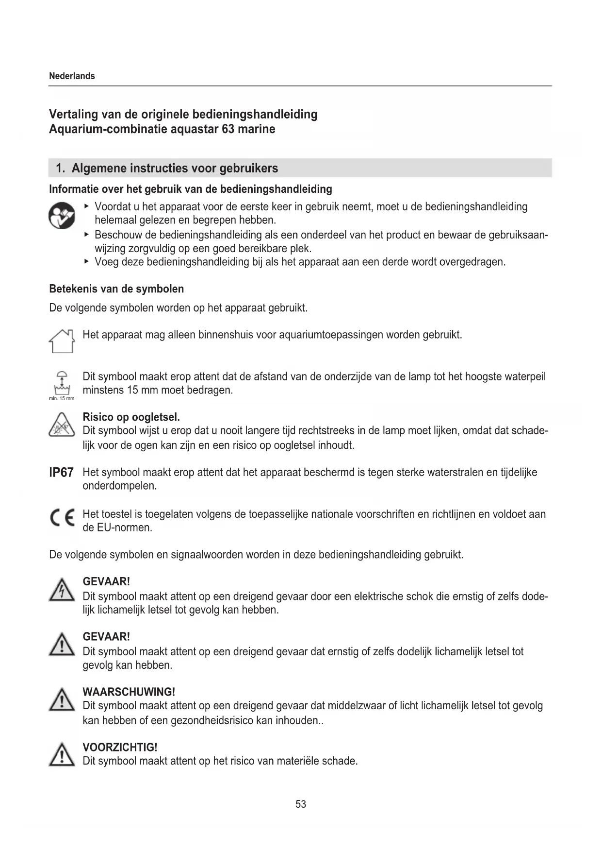 wijzing zorgvuldig op een goed bereikbare plek. ▶ Voeg deze bedieningshandleiding bij als het apparaat aan een derde wordt overgedragen. Betekenis van de symbolen De volgende symbolen worden op het apparaat gebruikt. Het apparaat mag alleen binnenshuis voor aquariumtoepassingen worden gebruikt. Dit symbool maakt erop attent dat de afstand van de onderzijde van de lamp tot het hoogste waterpeil minstens 15 mm moet bedragen. Risico op oogletsel. Dit symbool wijst u erop dat u nooit langere tijd rechtstreeks in de lamp moet lijken, omdat dat schade- lijk voor de ogen kan zijn en een risico op oogletsel inhoudt. Het symbool maakt erop attent dat het apparaat beschermd is tegen sterke waterstralen en tijdelijke onderdompelen. Het toestel is toegelaten volgens de toepasselijke nationale voorschriften en richtlijnen en voldoet aan de EU-normen. De volgende symbolen en signaalwoorden worden in deze bedieningshandleiding gebruikt. GEVAAR! Dit symbool maakt attent op een dreigend gevaar door een elektrische schok die ernstig of zelfs dode- lijk lichamelijk letsel tot gevolg kan hebben. GEVAAR! Dit symbool maakt attent op een dreigend gevaar dat ernstig of zelfs dodelijk lichamelijk letsel tot gevolg kan hebben. WAARSCHUWING! Dit symbool maakt attent op een dreigend gevaar dat middelzwaar of licht lichamelijk letsel tot gevolg kan hebben of een gezondheidsrisico kan inhouden.. VOORZICHTIG! Dit symbool maakt attent op het risico van materiële schade. min. 15 mm IP6754 Nederlands Aanwijzing met nuttige informatie en tips. Weergaveconventie Verwijzing naar een afbeelding, hier een verwijzing naar afbeelding A U dient een handeling uit te voeren.