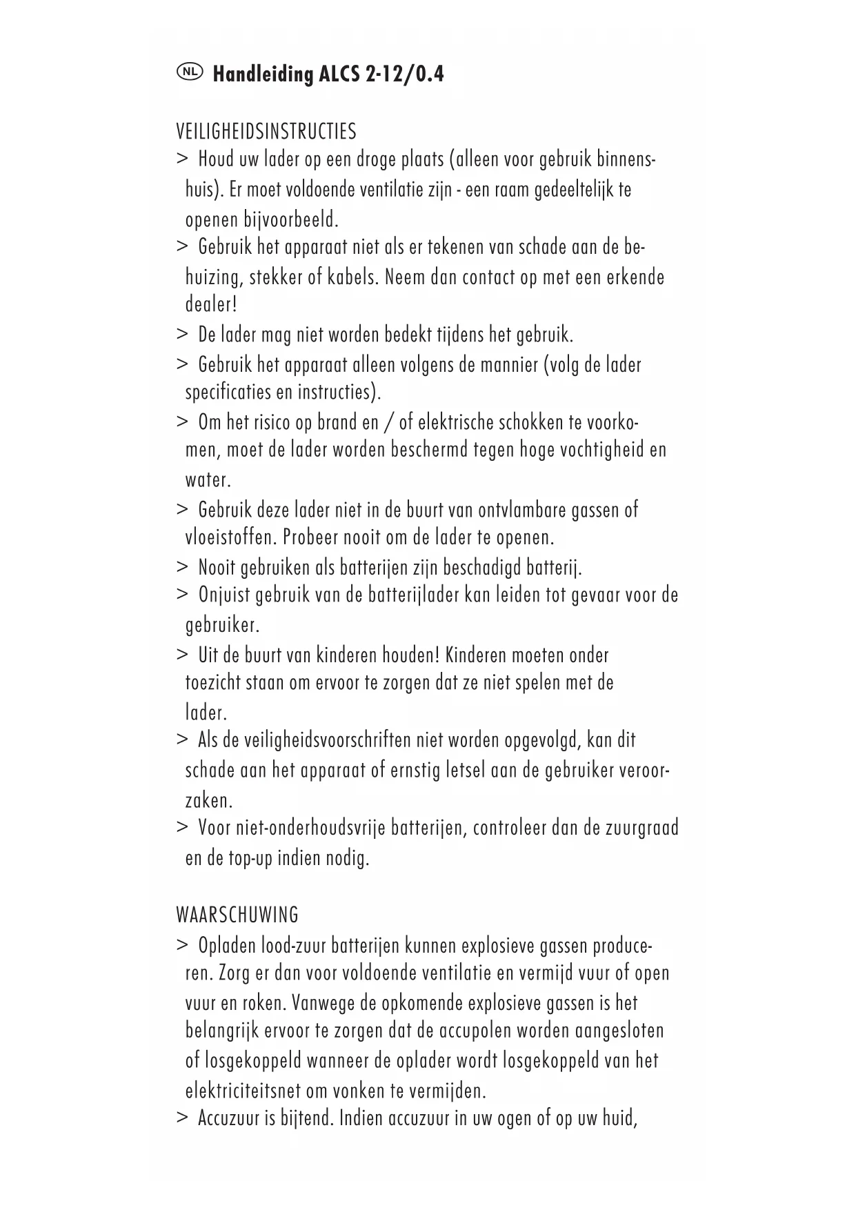 ANSMANN offre una garanzia di 3 anni su questo apparecchio. La garanzia non copre l’apparecchio per danni provocati da un suo uso improprio, diverso da quello in dicato in questo manuale. Handleiding ALCS 2-12/0.4 VEILIGHEIDSINSTRUCTIES > Houd uw lader op een droge plaats (alleen voor gebruik binnens- huis). Er moet voldoende ventilatie zijn - een raam gedeeltelijk te openen bijvoorbeeld. > Gebruik het apparaat niet als er tekenen van schade aan de be- huizing, stekker of kabels. Neem dan contact op met een erkende dealer! > De lader mag niet worden bedekt tijdens het gebruik. > Gebruik het apparaat alleen volgens de mannier (volg de lader specificaties en instructies). > Om het risico op brand en / of elektrische schokken te voorko- men, moet de lader worden beschermd tegen hoge vochtigheid en water. > Gebruik deze lader niet in de buurt van ontvlambare gassen of vloeistoffen. Probeer nooit om de lader te openen. > Nooit gebruiken als batterijen zijn beschadigd batterij. > Onjuist gebruik van de batterijlader kan leiden tot gevaar voor de gebruiker. > Uit de buurt van kinderen houden! Kinderen moeten onder toezicht staan om ervoor te zorgen dat ze niet spelen met de lader. > Als de veiligheidsvoorschriften niet worden opgevolgd, kan dit schade aan het apparaat of ernstig letsel aan de gebruiker veroor- zaken. > Voor niet-onderhoudsvrije batterijen, controleer dan de zuurgraad en de top-up indien nodig. WAARSCHUWING > Opladen lood-zuur batterijen kunnen explosieve gassen produce- ren. Zorg er dan voor voldoende ventilatie en vermijd vuur of open vuur en roken. Vanwege de opkomende explosieve gassen is het belangrijk ervoor te zorgen dat de accupolen worden aangesloten of losgekoppeld wanneer de oplader wordt losgekoppeld van het elektriciteitsnet om vonken te vermijden. > Accuzuur is bijtend. Indien accuzuur in uw ogen of op uw huid,onmiddellijk wassen met veel water spoelen en dringend medische hulp. > Zorg dat de accupolen in contact gebracht met de juiste polariteit (rood aan de positieve pool terminal, zwart aan de negatieve pool terminal). > Een vonk kan ontstaan als de lader is aangesloten op de accu, terwijl aangesloten op het lichtnet. Zorg ervoor deze is losgekoppeld van het lichtnet alvorens het aansluiten of loskop- pelen van de rode en zwarte laadkabels naar of van de batterij. FUNCTIE OVERZICHT > Loodaccu oplader voor 2V/6V/12V batterijen. > Beveiliging tegen kortsluiting, ompoling en bescherming tegen overlading. > Opladen met IU-curve > Geschikt voor het druppelladen > Druppelladen met de huidige instelling INBEDRIJFSTELLING