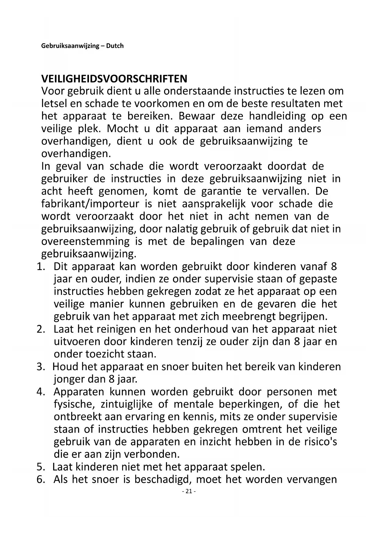 20. Laat het apparaat nooit onbeheerd achter wanneer het in