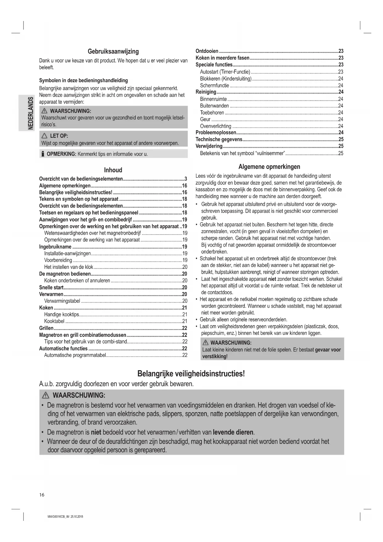 ” weer. Houd de STOP / CANCEL toets 3 seconden lang ingedrukt om het apparaat te ontgrendelen. U hoort een pieptoon. Het display toont de huidige tijd. Het “ ” symbool knippert. Een automatische startmodus is geprogrammeerd. U kunt de starttijd zien door op de TIMER / CLOCK toets te drukken. Druk op de STOP / CANCEL toets om het programma te annuleren. Het draaiplateau geeft een krassend of schurend geluid. Er bevinden zich vuil of vreemde voorwerpen in de omgeving van de aandrijfas van het draaiplateau. Verwijder eventuele voorwerpen en restanten van levensmiddelen zoals beschreven onder “Reiniging”. Het apparaat wordt ogenschijnlijk zonder reden uitgeschakeld. Het apparaat is defect. Neem contact op met onze klantenservice. Technische gegevens Model:....................................................................................MWG 6016 CB Spanningstoevoer: .................................................................. 230 V~, 50 Hz Opgenomen vermogen: Magnetron: ....................................................................................1150 W Gril: ................................................................................................. 800 W Gemeten uitgangsvermogen magnetron: .........................700 W / 2450 MHz Volume gaarruimte: .....................................................................ong. 20 liter Beschermingsklasse: ................................................................................... Nettogewicht: ........................................................................... ong. 11,65 kg Het recht om technische en ontwerpaanpassingen te maken in de loop van voortdurende productontwikkeling blijft voorbehouden. Dit apparaat voldoet aan alle huidige CE-richtlijnen, zoals de richtlijn elektromagnetische compatibiliteit en de laagspanningsrichtlijn, en is gefa- briceerd volgens de meest recente veiligheidsvoorschriften. Verwijdering Betekenis van het symbool “vuilnisemmer” Bescherm ons milieu, elektrische apparaten horen niet in het huisafval. Maak voor het afvoeren van elektrische apparaten gebruik van de voorgeschreven verzamelpunten en geef daar de elektrische apparaten af die u niet meer gebruikt. Daardoor helpt u de potentiële effecten te voorkomen die een verkeerde afvoer op het milieu en de menselijke gezondheid kunnen hebben. Op deze wijze levert u uw bijdrage aan het hergebruik, de recycling en andere verwerkingsvormen voor oude elektronische en elektrische appa- raten. Voor informatie over verzamelpunten voor uw apparaten kunt u contact opnemen met uw gemeente of gemeenteadministratie.26