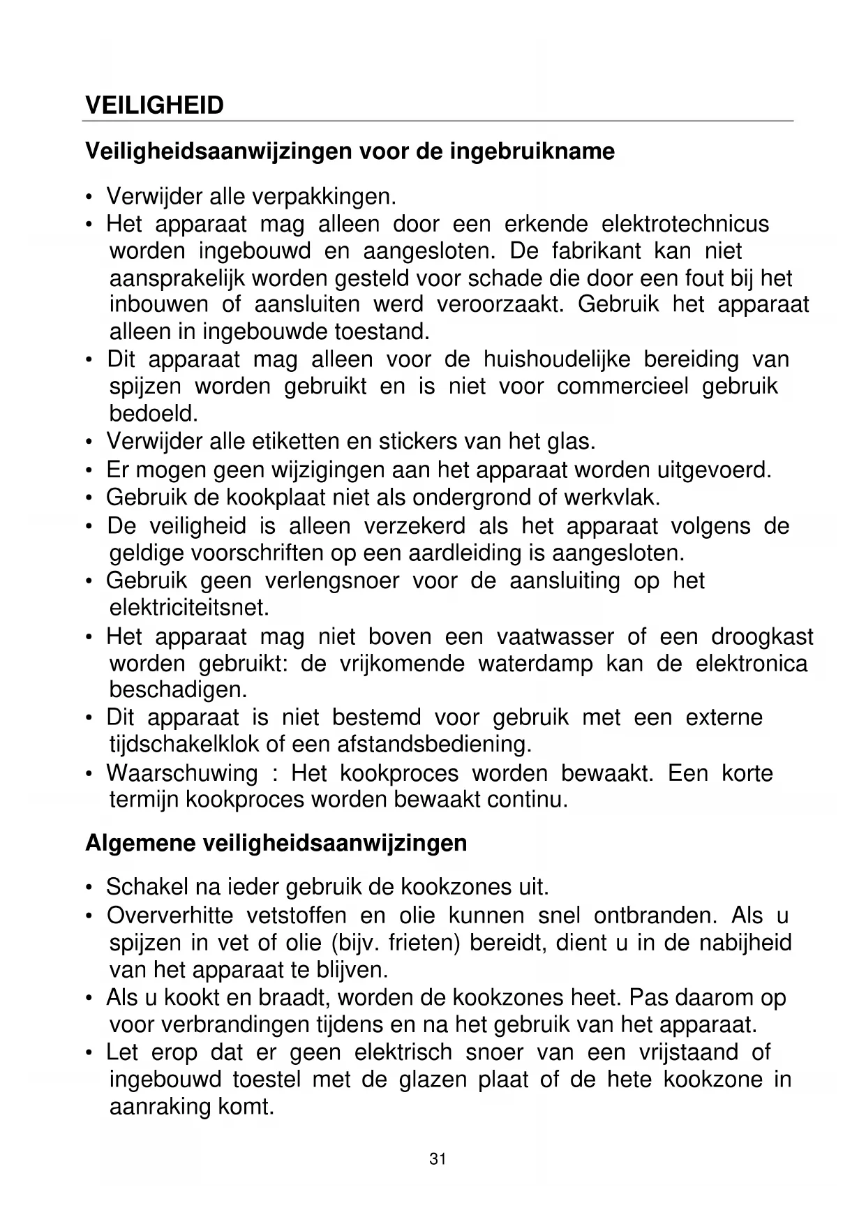 .Beste klant! Hartelijk dank voor uw keuze van onze keramische kookplaat. Voor het beste gebruik van uw apparaat, lees deze gebruiksaanwijzing grondig door en bewaar het voor latere raadpleging. INHOUDSOPGAVE VEILIGHEID ................................................................................................................................. 31
