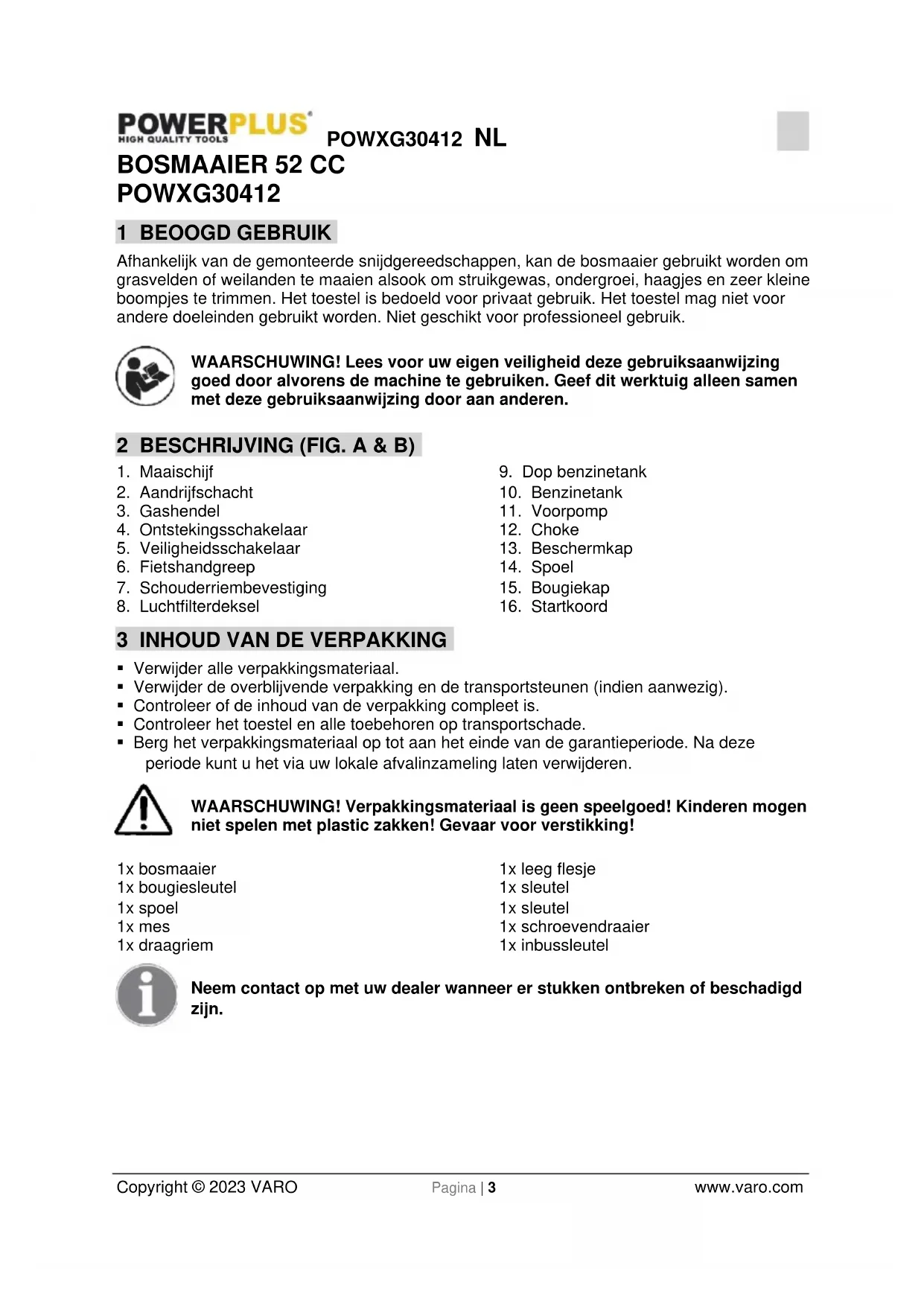 - Berg het verpakkingsmateriaal op tot aan het einde van de garantieperiode. Na deze periode kunt u het via uw lokale afvalinzameling laten verwijderen. WAARSCHUWING! Verpakkingsmateriaal is geen speelgoed! Kinderen mogen niet spelen met plastic zakken! Gevaar voor verstikking! 1x bosmaaier 1x bougiesleutel 1x spoel 1x mes 1x draagriem 1x leeg flesje 1x sleutel 1x sleutel 1x schroevendraaier 1x inbussleutel Neem contact op met uw dealer wanneer er stukken ontbreken of beschadigd zijn.POWXG30412 NL Copyright © 2023 VARO Pagina | 4 www.varo.com