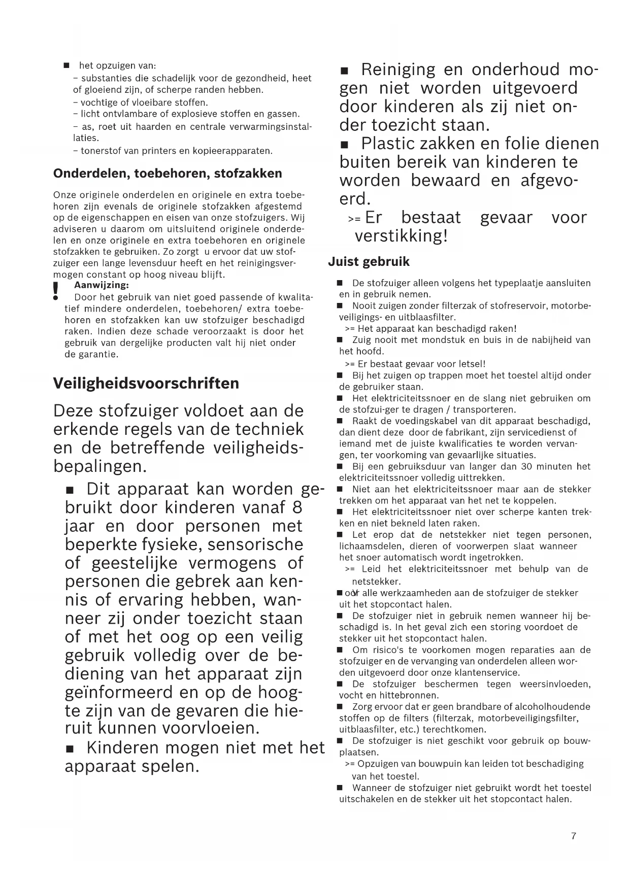 Het verheugt ons dat u voor een Siemens stofzuiger uit de serie VS06 heeft gekozen. In deze gebruiksaanwijzing worden verschillende VS06 – modellen beschreven. Het is dan ook mogelijk dat niet alle genoemde kenmerken en functies gelden voor uw toestel. U dient alleen gebruik te maken van originele acces- soires van Siemens, die speciaal voor uw stofzuiger ontwikkeld zijn om een zo goed mogelijk resultaat te bereiken. Gelieve de pagina’s met afbeeldingen uit te klappen! Beschrijving van het apparaat 1 Omschakelbaar vloermondstuk* 2 Mondstuk voor harde vloeren* 3 Mondstuk voor harde vloeren Polymatic* 4 Mondstuk voor haren van dieren* 5 Telescoopbuis* 6 Schuiftoets* 7 Zuigbuis* 8 Handgreep van de slang* 9 Zuigslang 10 Bekledingsmondstuk* 11 Mondstuk voor kieren* 12 Combimondstuk* 13 Parkeerhulp 14 Elektriciteitssnoer 15 Uitblaasfilter 16 Aan-/uittoets met elektronische zuigkrachtregelaar* 17 Stofreservoir voor het zuigen zonder filterzak of alternatief 18 Filterzak* 19 Motorbeveiligingsfilter, uitwasbaar 20 Opbergklem (aan de onderkant van het apparaat) 21 Deksel voor stofreservoir 22 Handgrepen (aan voor- en achterzijde) 23 Uitblaasrooster 24 Filtervervangindicatie* *afhankelijk van de uitvoering Onderdelen en extra toebehoren A Verpakking reservefilter Filter type PowerProtect (onderdeel-nr.: VZ41FGALL) ("Voor een hoge zuigkracht"/ "voor uitstekende prestaties en een hoogwaardige reinigingskwa- liteit") Inhoud: - 4 stofzakken met sluiting - 1 micro-hygiënefilter Wij adviseren u om uitsluitend gebruik te maken van onze originele stofzakken. Uw apparaat is een zeer efficiënte stofzuiger, die bij het gebruik van hoogwaardige stofzakken zeer goede resultaten geeft. Alleen bij gebruik van hoogwaardige stofzakken, met name de originele stofzuigerzakken van Sie- mens, worden de waarden bereikt die op het EU energie-label staan aangegeven voor de energie- efficiencyklasse, de stofopname en het stofretentie- vermogen.Bij gebruik van stofzakken van mindere kwaliteit (bijv. papieren zakken) kunnen bovendien de levensduur en het vermogen van uw toestel aanzienlijk worden beïnvloed. Ook kan uw stofzuiger door het gebruik van niet goed passende of kwalitatief mindere stofzakken beschadigd raken. Deze schade valt niet onder onze garantie. Meer informatie hierover vindt u onder www.siemens-home.bsh-group.com/dust-bag. Hier kunt u ook onze originele stofzuigerzakken bestel- len. B Textielfilter (duurzaam filter) VZ10TFG Recyclebaar filter met klittenband. C HEPA-Filter VZ153HFB Extra filter voor schonere uitblaaslucht. Aanbevolen voor mensen die allergisch zijn. Jaarli- jks vervangen. D Micro-actiefkoolfilter VZ192MAF Combinatie van micro en actief koolfilter. Gaat lange tijd storende geurtjes tegen. Halfjaarlijks vervangen. Koolfilterframe vervangen door het frame van de microfilter. Let op! Combinatie van "Hepa-Filter" + "Micro-actiefkoolfil- ter" miet mogelijk. E Mondstuk voor harde vloeren VZ123HD Voor het zuigen van gladde vloeren (parket, tegels, terracotta,...) Voor het eerste gebruik Afbeelding