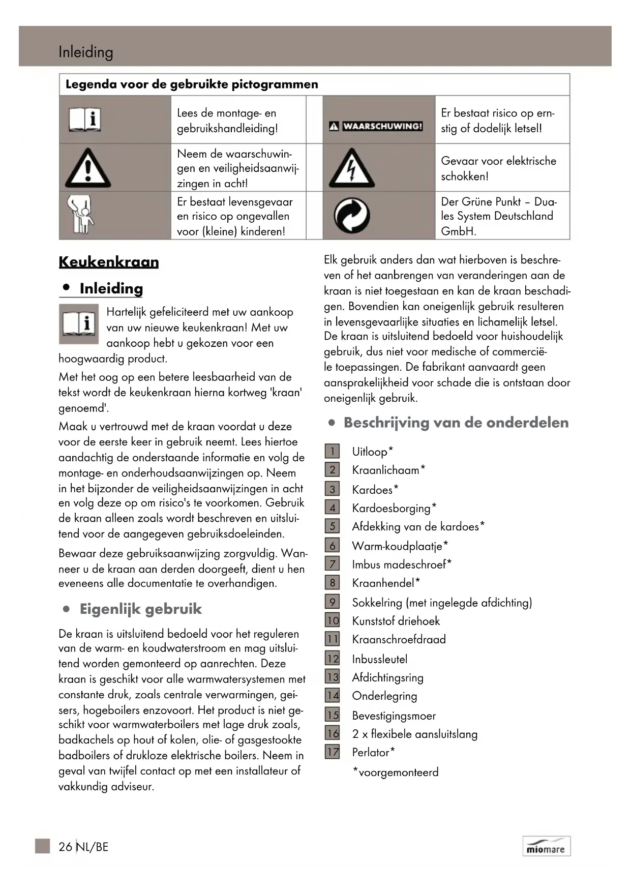 Perlator* *voorgemonteerd Legenda voor de gebruikte pictogrammen Lees de montage- en gebruikshandleiding! Er bestaat risico op ern- stig of dodelijk letsel! Neem de waarschuwin- gen en veiligheidsaanwij- zingen in acht! Gevaar voor elektrische schokken! Er bestaat levensgevaar en risico op ongevallen voor (kleine) kinderen! Der Grüne Punkt – Dua- les System Deutschland GmbH.27NL/BE Monteren