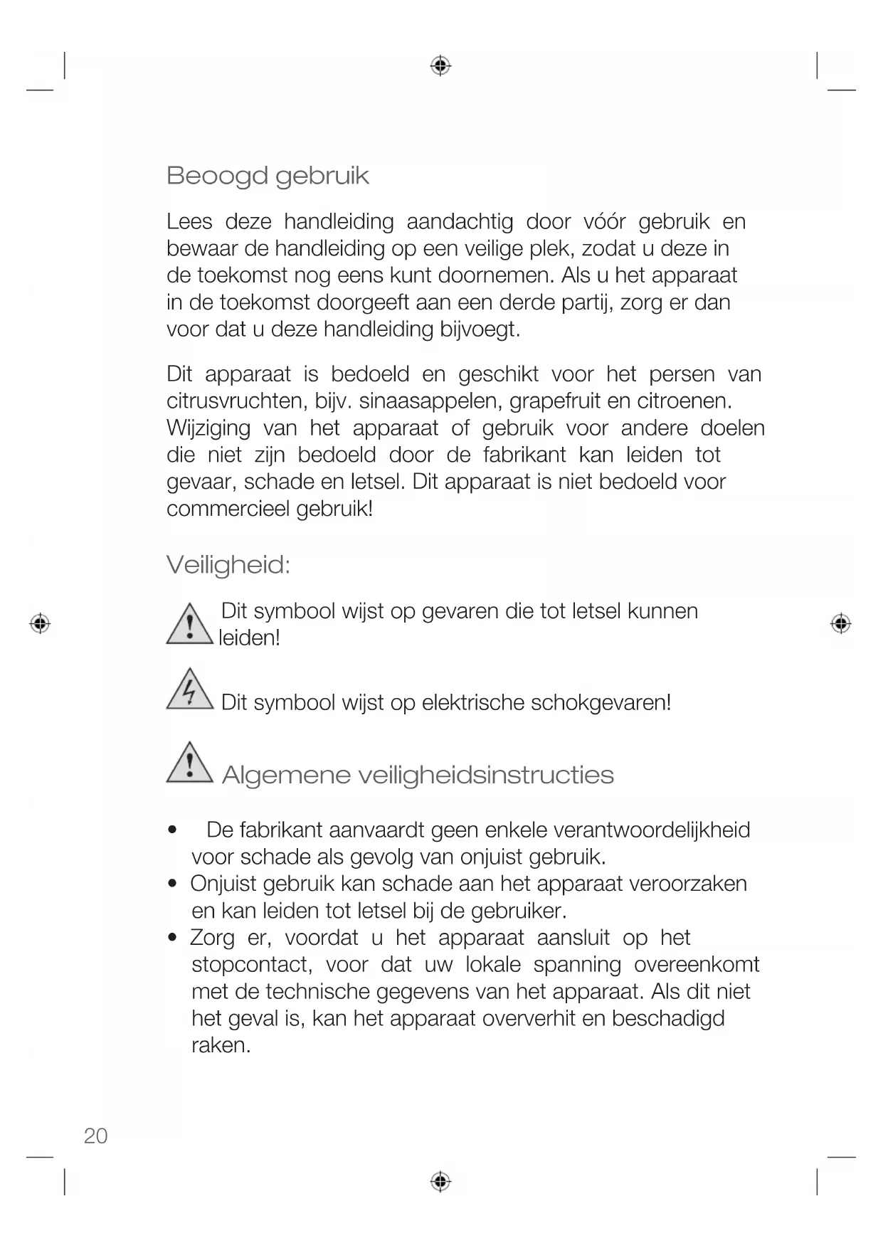 - fordamagescausedbyowner This guarantee does not affect your statutory right, nor any legal right you may have as a costumer under applicable national legislation governing the purchase of goods. Inordertoasserthis/herrightinaguaranteecaseduringthe guaranteed period, the customer must provide evidence of thedateofpurchase(receipt). The guarantee is to be asserted against KORONA electric GmbH, Sundern/Germany. Service Address: KORONA Service, Am Steinbach 9, 59872 Meschede, Germany Telephone Hotline: 02933 90284-80 Mail: service@korona-electric.de web: www.korona-electric.de within 2 years after the date of purchase. In case of guarantee the customer is given the right to get the appliance repaired atourownoratanauthorizedshop.Furtherrights(dueto guaranteecase)arenotgiventothecustomer.20 Beoogd gebruik Lees deze handleiding aandachtig door vóór gebruik en bewaar de handleiding op een veilige plek, zodat u deze in de toekomst nog eens kunt doornemen. Als u het apparaat in de toekomst doorgeeft aan een derde partij, zorg er dan voor dat u deze handleiding bijvoegt. Dit apparaat is bedoeld en geschikt voor het persen van citrusvruchten, bijv. sinaasappelen, grapefruit en citroenen. Wijziging van het apparaat of gebruik voor andere doelen die niet zijn bedoeld door de fabrikant kan leiden tot gevaar, schade en letsel. Dit apparaat is niet bedoeld voor commercieel gebruik! Veiligheid: Dit symbool wijst op gevaren die tot letsel kunnen leiden! Dit symbool wijst op elektrische schokgevaren! Algemene veiligheidsinstructies