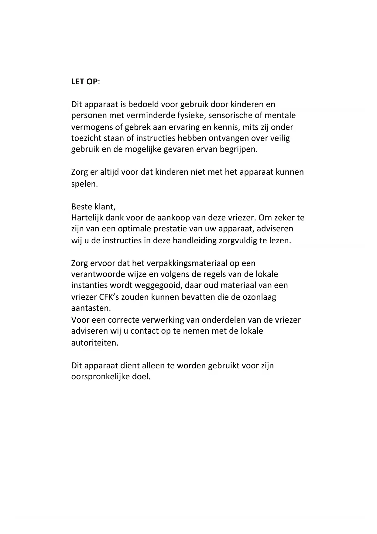 GEBRUIKERSHANDLEIDING FRB3200WHLET OP: Dit apparaat is bedoeld voor gebruik door kinderen en personen met verminderde fysieke, sensorische of mentale vermogens of gebrek aan ervaring en kennis, mits zij onder toezicht staan of instructies hebben ontvangen over veilig gebruik en de mogelijke gevaren ervan begrijpen. Zorg er altijd voor dat kinderen niet met het apparaat kunnen spelen. Beste klant, Hartelijk dank voor de aankoop van deze vriezer. Om zeker te zijn van een optimale prestatie van uw apparaat, adviseren wij u de instructies in deze handleiding zorgvuldig te lezen. Zorg ervoor dat het verpakkingsmateriaal op een verantwoorde wijze en volgens de regels van de lokale instanties wordt weggegooid, daar oud materiaal van een vriezer CFK’s zouden kunnen bevatten die de ozonlaag aantasten. Voor een correcte verwerking van onderdelen van de vriezer adviseren wij u contact op te nemen met de lokale autoriteiten. Dit apparaat dient alleen te worden gebruikt voor zijn oorspronkelijke doel.WAARSCHUWING: