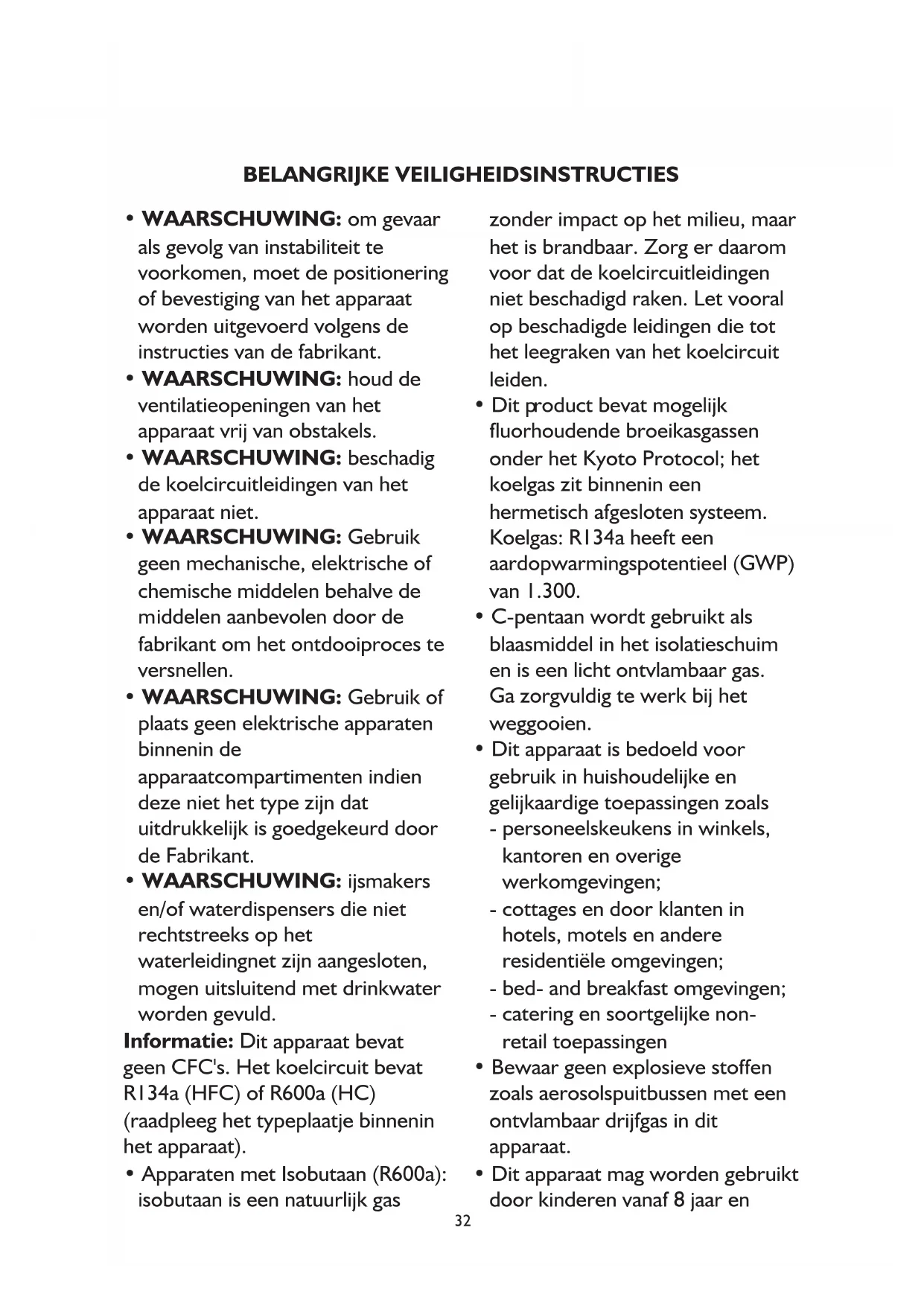 - WAARSCHUWING: ijsmakers en/of waterdispensers die niet rechtstreeks op het waterleidingnet zijn aangesloten, mogen uitsluitend met drinkwater worden gevuld. Informatie: D it apparaat bevat geen CFC's. Het koelcircuit bevat R134a (HFC) of R600a (HC) (raadpleeg het typeplaatje binnenin het apparaat).