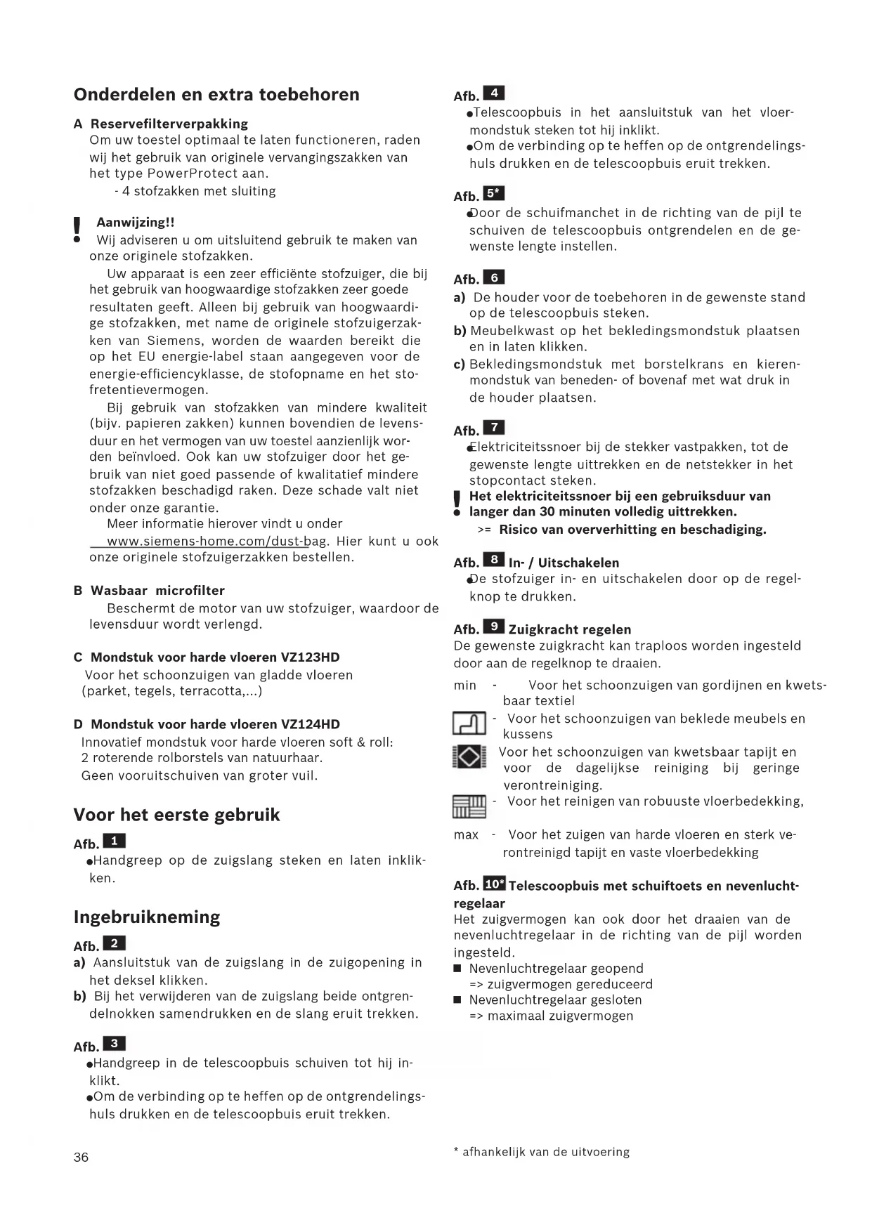 Aanwijzing!! Wij adviseren u om uitsluitend gebruik te maken van onze originele stofzakken. Uw apparaat is een zeer efficiënte stofzuiger, die bij het gebruik van hoogwaardige stofzakken zeer goede resultaten geeft. Alleen bij gebruik van hoogwaardi- ge stofzakken, met name de originele stofzuigerzak- ken van Siemens, worden de waarden bereikt die op het EU energie-label staan aangegeven voor de energie-efficiencyklasse, de stofopname en het sto- fretentievermogen. Bij gebruik van stofzakken van mindere kwaliteit (bijv. papieren zakken) kunnen bovendien de levens- duur en het vermogen van uw toestel aanzienlijk wor- den beïnvloed. Ook kan uw stofzuiger door het ge- bruik van niet goed passende of kwalitatief mindere stofzakken beschadigd raken. Deze schade valt niet onder onze garantie. Meer informatie hierover vindt u onder www.siemens-home.com/dust-bag. Hier kunt u ook onze originele stofzuigerzakken bestellen. B Wasbaar microfilter Beschermt de motor van uw stofzuiger, waardoor de levensduur wordt verlengd. C Mondstuk voor harde vloeren VZ123HD Voor het schoonzuigen van gladde vloeren (parket, tegels, terracotta,...) D Mondstuk voor harde vloeren VZ124HD Innovatief mondstuk voor harde vloeren soft & roll: 2 roterende rolborstels van natuurhaar. Geen vooruitschuiven van groter vuil. Voor het eerste gebruik Afb.