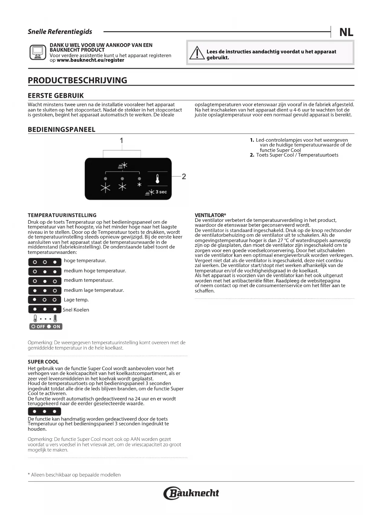- Vériez que l'appareil est de niveau. FRNL Snelle Referentiegids DANK U WEL VOOR UW AANKOOP VAN EEN BAUKNECHT PRODUCT Voor verdere assistentie kunt u het apparaat registeren op www.bauknecht.eu/register Lees de instructies aandachtig voordat u het apparaat gebruikt. PRODUCTBESCHRIJVING EERSTE GEBRUIK Wacht minstens twee uren na de installatie vooraleer het apparaat aan te sluiten op het stopcontact. Nadat de stekker in het stopcontact is gestoken, begint het apparaat automatisch te werken. De ideale opslagtemperaturen voor etenswaar zijn vooraf in de fabriek afgesteld. Na het inschakelen van het apparaat dient u 4-6 uur te wachten tot de juiste opslagtemperatuur voor een normaal gevuld apparaat is bereikt. BEDIENINGSPANEEL
