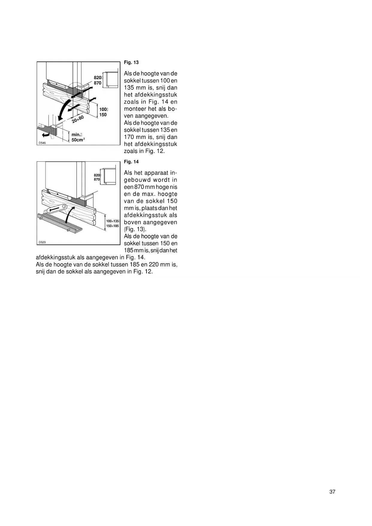 D51837 Fig. 13 Als de hoogte van de sokkel tussen 100 en 135 mm is, snij dan het afdekkingsstuk zoals in Fig. 14 en monteer het als bo- ven aangegeven. Als de hoogte van de sokkel tussen 135 en 170 mm is, snij dan het afdekkingsstuk zoals in Fig. 12. Fig. 14 Als het apparaat in- gebouwd wordt in een 870 mm hoge nis en de max. hoogte van de sokkel 150 mm is, plaats dan het afdekkingsstuk als boven aangegeven (Fig. 13). Als de hoogte van de sokkel tussen 150 en 185 mm is, snij dan het afdekkingsstuk als aangegeven in Fig. 14. Als de hoogte van de sokkel tussen 185 en 220 mm is, snij dan de sokkel als aangegeven in Fig. 12.